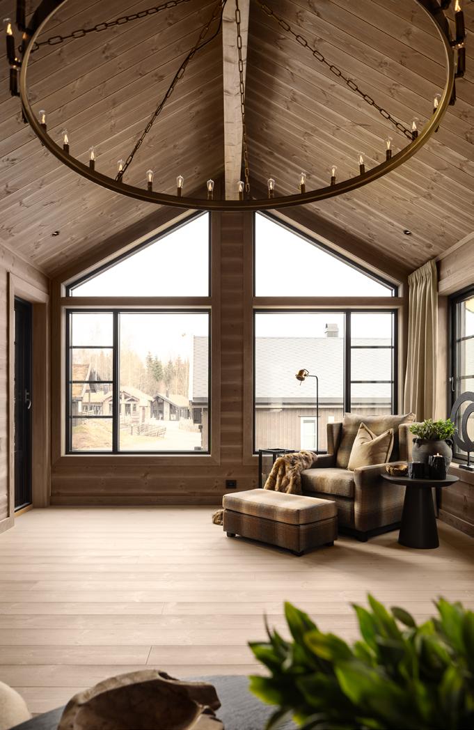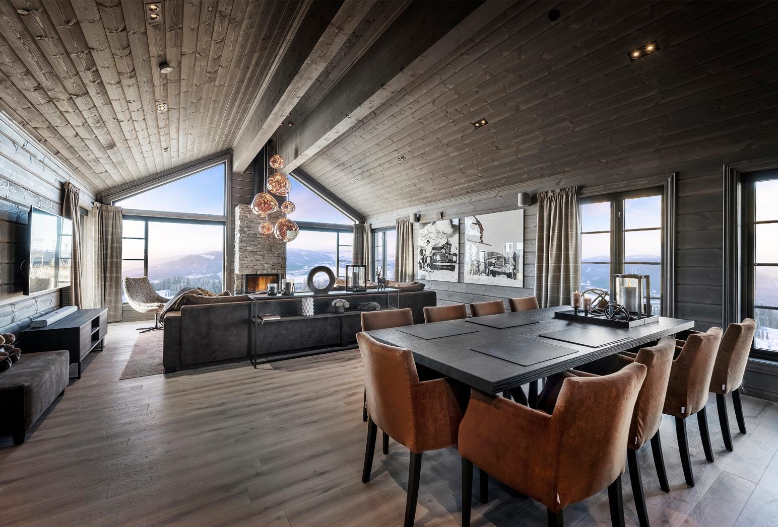 En moderne peis i stuen, plassert i enden av hytta, blir et naturlig samlingspunkt ved ankomst. Den generøse takhøyden gir rommet en luftig og behagelig følelse.