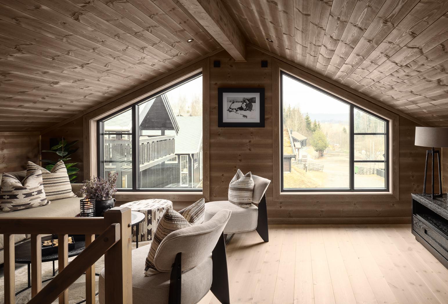 Romslig hytte med hems, luftige oppholdsrom, panoramavinduer og stor terrasse.