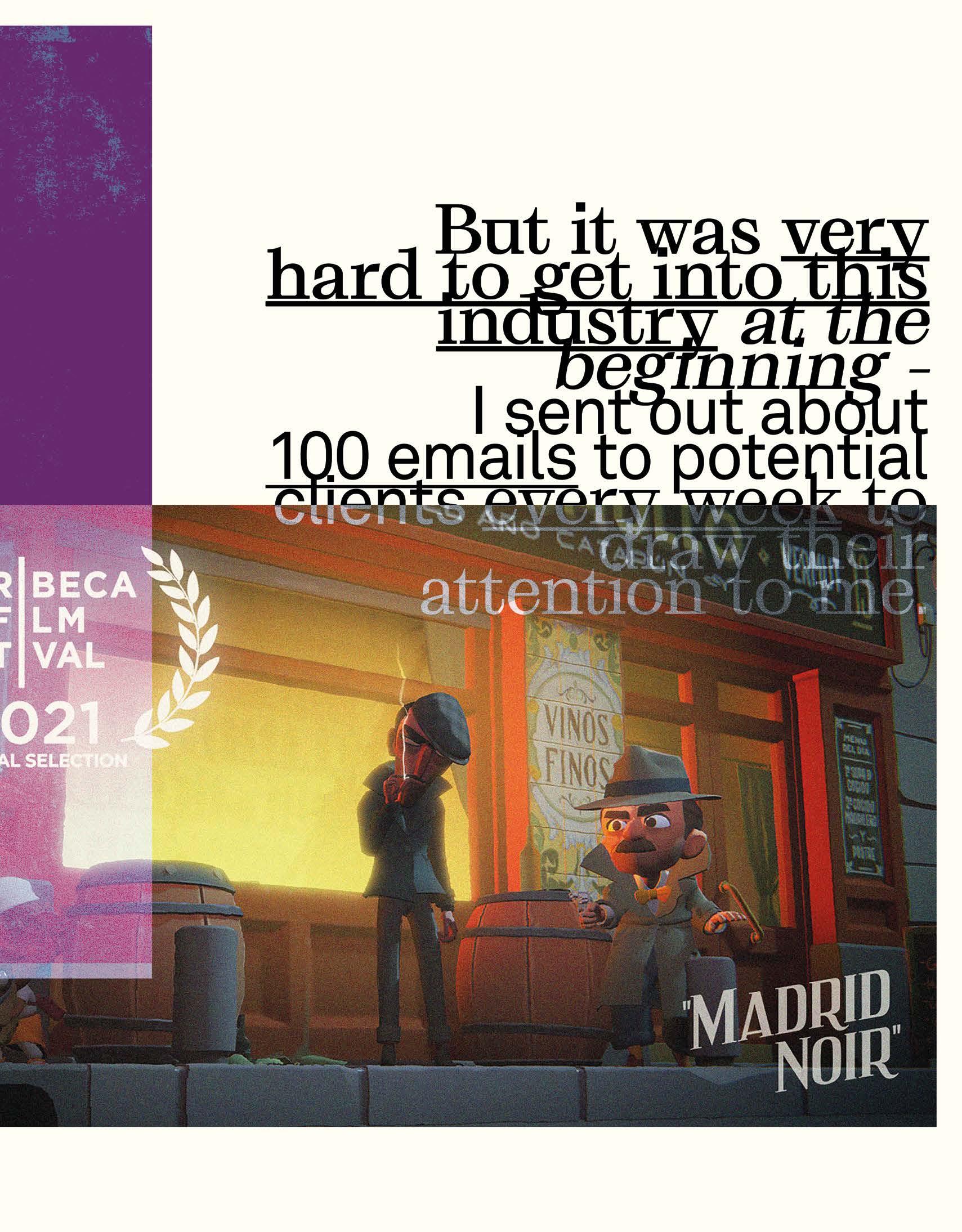 Ja, dort habe ich aber auch das erste Mal mitgekriegt, wie intensiv diese Arbeit sein kann. Ich bin immer schon ein sehr aktiver Mensch gewesen, war immer viel draußen, habe immer viel Sport gemacht, und dort war ich plötzlich das erste Mal sieben Tage die Woche nur am Arbeiten und vor dem Screen. Das wurde dort erwartet, vor allem wenn große Projekte abzuwickeln waren, dass man an den Wochenenden auch arbeitet. Und als Praktikant macht man ja sowieso alles mit und will sein Bestes geben das hat mich sicher geprägt, da habe ich gemerkt, das mache ich sicher nicht mein Leben lang. Aber es war klar, dass ich Motion Design weitermache, also bin ich zurück nach Österreich und habe bei den Jungs von EAT MY DEAR (http://eatmydear.com) gearbeitet. Das war zwar intensiv, aber es war schon viel lockerer mit den Burschen, weil wir uns gut verstanden und nur hin wieder mal ein Wochenende durchgearbeitet haben.