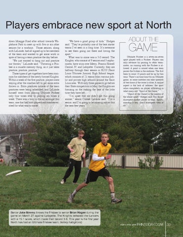 Players embrace new sport at North down Muegge Road after school towards Waplehorst Park to meet up with five or six other seniors for a workout. Those seniors, along with LaLonde, had all signed up to be members of the team and wanted to get some work in spite of having a team practice the day before. “We just wanted to hang out and practice our throws,” LaLonde said. “Throwing a Frisbee is a muscle memory thing, so it just takes practice, practice, practice.” These types of get-togethers have been common for members of the newly formed Knights. Within a week of the first practice, players were staying after the coaches left to get some extra throws in. Extra practices outside of the team practices were being scheduled, and LaLonde himself went from playing Ultimate Frisbee only four times ever to playing six times a week. There was a buzz in the air amongst this team, one that had both players and coaches excited for what was to come.