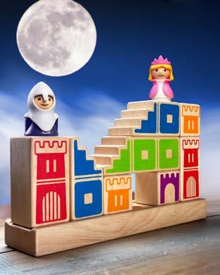 Über das Material dieses Spiels freuen sich auch Holzpädagog*innen. Acht ansprechende Holzbauteile sollen dazu genutzt werden, um zwei Figuren zu verbinden, die auf gegenüber liegenden Seiten eines schmalen Baurahmens stehen. Der Kniff liegt darin, dass bei jedem der insgesamt 48 Rätsel nur bestimmte der acht Teile genutzt werden dürfen. Diese dürfen liegend oder stehend in jeweils vorgegebene Anfangsaufstellungen verbaut werden. Bedingungen: Die Konstruktion muss in sich stabil stehen und am Ende müssen Burgfräulein und Ritter zueinander über Treppen, Wege oder Brücken und ohne Abgründe laufen können.