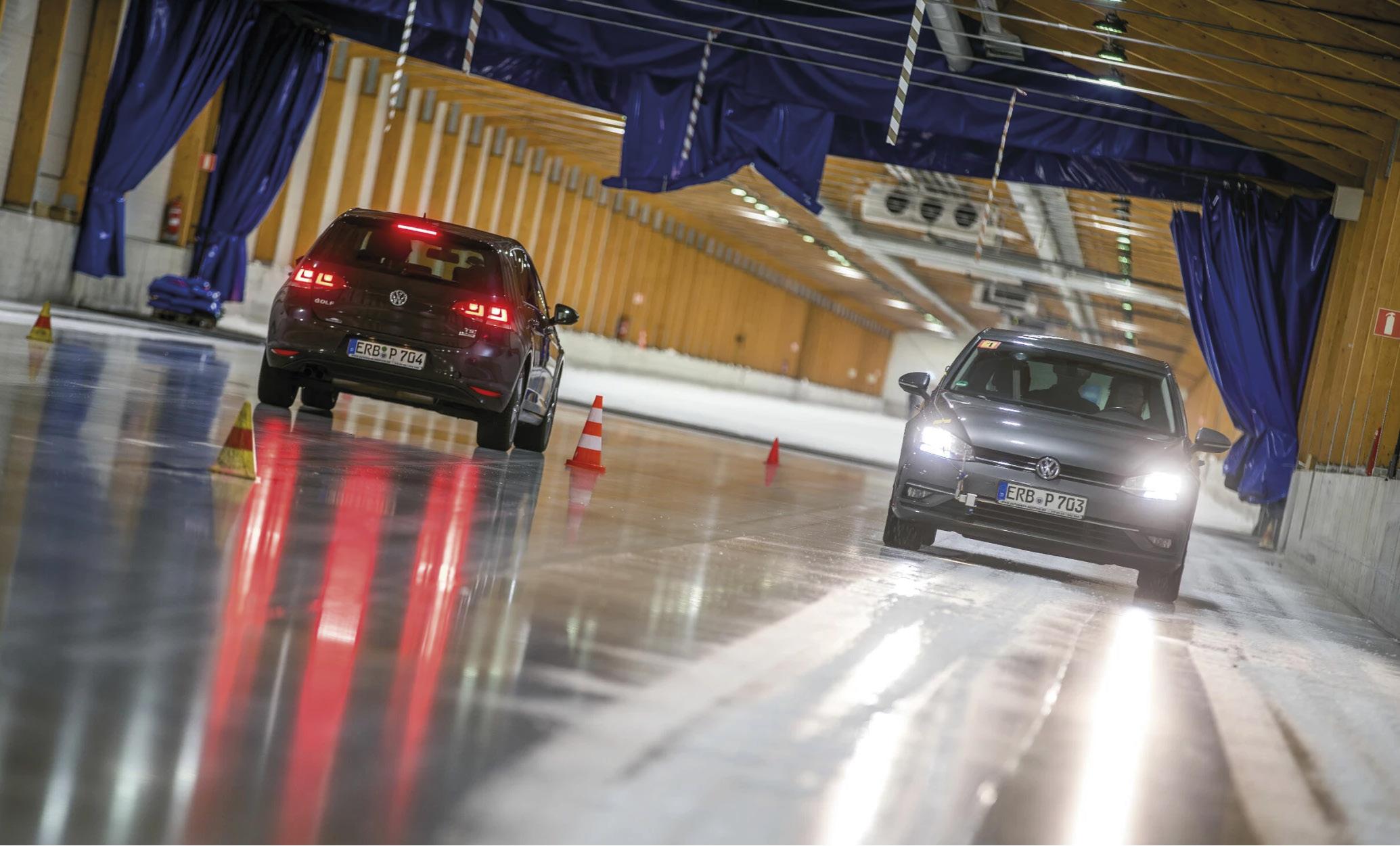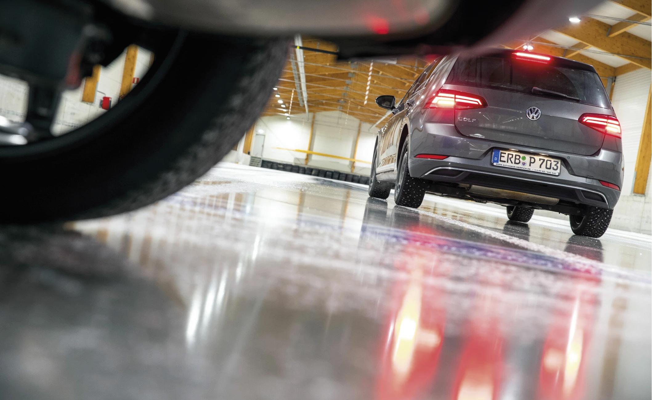 Hemlunarvegalengdir eru mældar í snjó, votu og þurru malbiki. Hvert hemlunarpróf er margendurtekið, 15-20 sinnum, við mismunandi hitastig yfir nokkurra daga tímabil. Á ís er hemlað frá 20 km niður í 5 km. Í snjó er hemlað frá 35 km hraða niður í 5 km. Á voru og þurru malmbiki er hemlað af 80 km hraða niður í 5 km. Hemlunarprófanir á snjó og ís fara fram bæði utan- og innanhús við mismunandi hita- og rakastig sem þar má stjórna og þannig lágmarka áhrif veðurs á niðustöðu.