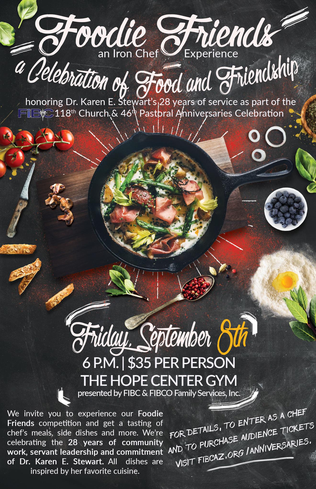 We invite you to experience our Foodie Friends competition as an audience judge Your ticket purchase includes a tasting of all the chef’s meals, as well as other appetizing side dishes and more. Tickets for Foodie Friends are $35 per person. As an audience judge you will be given a ballot for the foodie competition. Tickets are non-refundable, but transferable. All entrants, 5years-old and up, must have a ticket Infants and toddlers under 5-years-old are not expected to eat All anniversaries related information can be found at fibcaz.org/anniversaries.