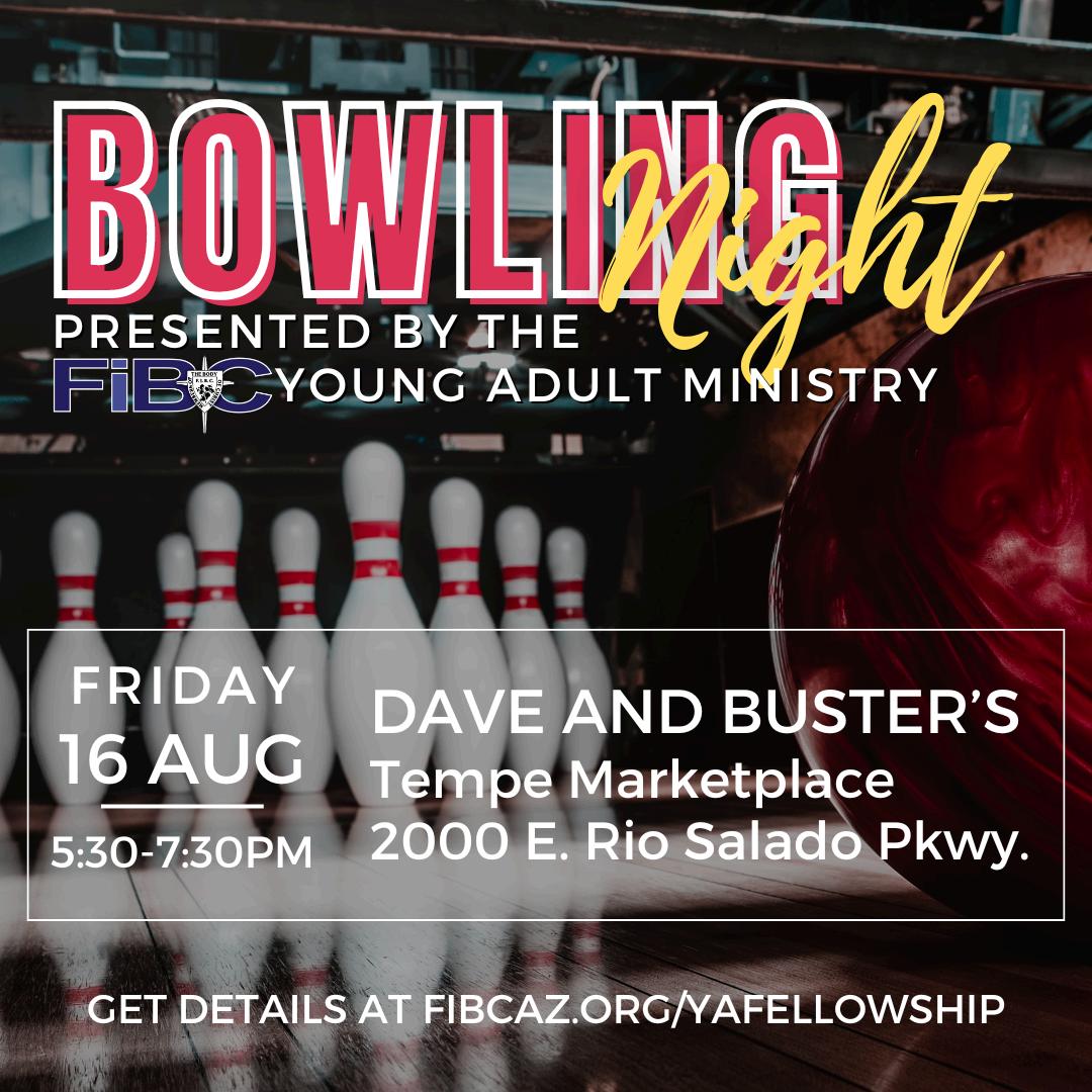 The next young adult fellowship opportunity takes place on Friday, August 16, 2024 at Dave and Buster's Tempe Marketplace. We're going to let the good times roll with some friendly bowling games, along with all the other great experiences D&B has to offer.