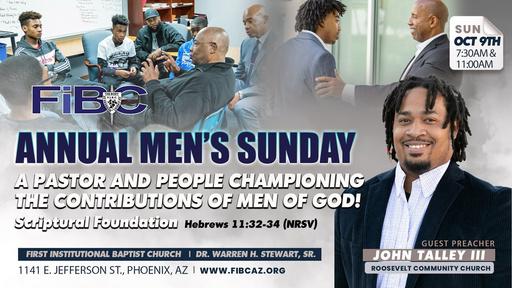 This month, our October 2022 FIBC Theme Focus is A PASTOR AND PEOPLE CHAMPIONING THE CONTRIBUTIONS OF MEN OF GOD!” We look forward to recognizing, encouraging and honoring our men and boys for their commitment, strength, sacrifices and successes as members of the Body of Christ, and particularly, FIBC. Please invite the men and boys in your lives to join us in person or virtually for our Sunday worship services beginning on October 2, 2022.