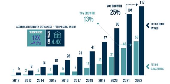 Os números preliminares mostram que a região alcançará 57,7 milhões de assinantes de FTTH até o final de 2022, representando um crescimento de 25% em comparação com os 46,3 milhões de assinantes registrados em dezembro de 2021. Da mesma forma, estimase que 116,8 milhões de domicílios tenham sido ultrapassados até o final de 2022, representando um crescimento anual de 13%, em comparação com os 103,6 milhões de domicílios registrados no final de 2021.