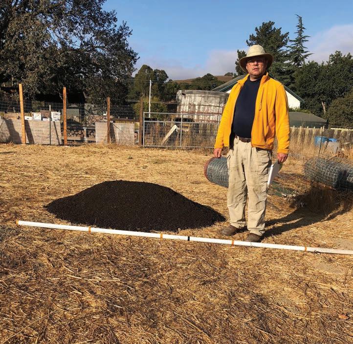 In 2018 Meridian Farm installed a hedgerow and applied compost to a section of their pastures with funding support from the Healthy Soils Program. Here Peter Lofting demonstrates the method he developed to apply compost at a precise rate to small acreages. (photo by Meridian Farm)