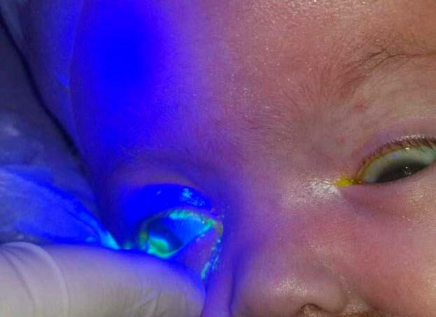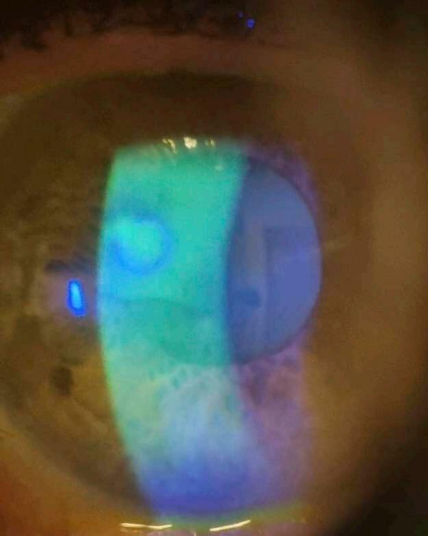 A mediados de diciembre 2021, presenta una queratitis bac teriana estadio 3 de la clasificación de Dan Yones (Washing ton 1979) (úlcera de más de 6 mm de diámetro con hipopion, afectación del ⅓ posterior estromal y peligro de perforación (foto 1).