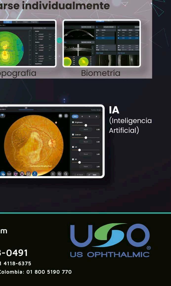 treo hasta la pared ocular. Cuenta con una nueva tecnología de imagen UBM que permite dife rentes modos de imagen, sensor de movimiento exclusivo IMUv™ que permite localizar el haz de ultrasonidos en tiempo real en el diagrama ocular, software intuitivo y fá cil de usar para una mejor experiencia de navegación. En su modo glaucoma permite la cuantificación semiauto mática de AOD, TIA, IT, ARA, LV para facilitar los exámenes y comprender los mecanismos del iris, el cristalino y los cuerpos ciliares en pacientes con glaucoma También está disponible en Modo Standarizado. El modo A Standarizado permite el diagnóstico de lesiones tumorales, diagnóstico de desprendimiento de retina/membrana vítrea y diagnóstico de enfermedad de Graves.