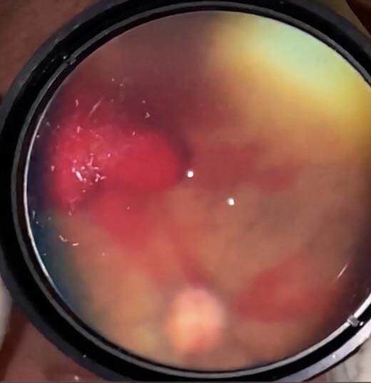 No tenemos novedades de la paciente y a los 15 días de verla en la UCIN concurre por consultorio externo para control de fondo de ojo con diagnóstico de IP confirmado por biosia cutánea. Se realiza oftalmoscopía binocular indirecta: ojo derecho normal (vascularización incompleta en periferia) y ojo izquierdo: retinopatía exudativa, hemorragia retiniana, shunts a-v, neovasos en polo posterior. (Fig.1 y 2)