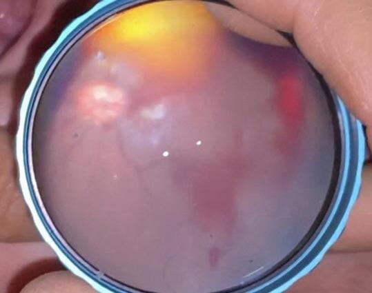 Se realiza fondo de ojo. Ojo derecho normal pero con vascularización incompleta en periferia. Ojo izquierdo se evidencia exudado (localizado en sector temporal entre arcadas vasculares). Se solicita TORCH.