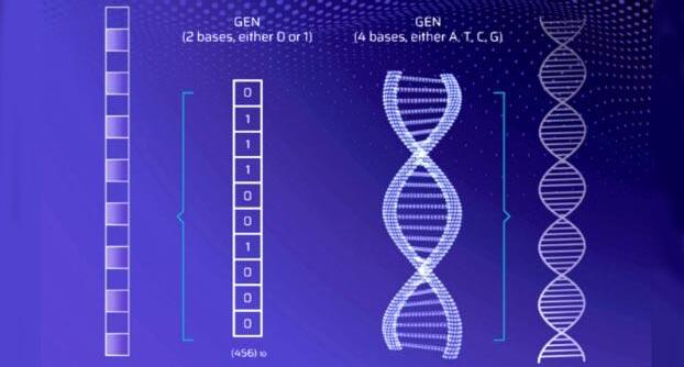 Se muestra a la izquierda un genoma binario del lente. A la derecha, un ejemplo de un genoma humano. A diferencia del genoma mostrado a la izquierda, se puede observar que el genoma natural es diploide y consta de cuatro bases