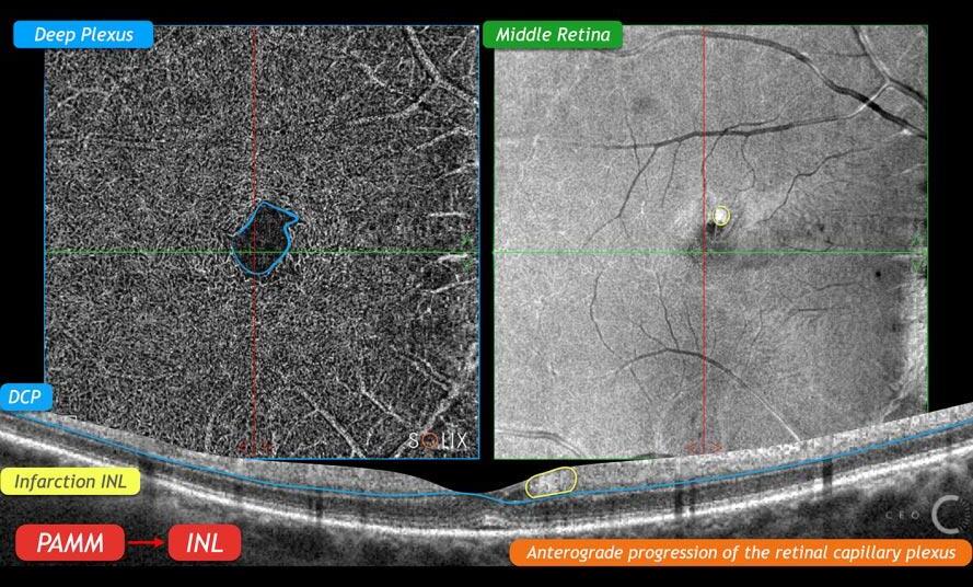 La Maculopatía Media Aguda Paracentral (PAMM), comienza con el compromiso del PCP, siendo probable la alteración del PCI por continuidad en una isquemia venosa profunda más severa. En esta entidad la presentación típica es con hiperreflectividad en banda de la Capa Nuclear Interna (CNI), produciendo infarto de la retina interna. La secuela de la PAMM es el adelgazamiento de la CNI. Si recordamos la disposición de estos dos plexos bordeando la CNI, y la alta demanda metabólica en este sector, podremos pensar en una progresión anterógrada vascular con afectación del PCS.