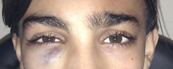 Figura 2. Se observa en posición primaria de la mirada leve equimosis y edema palpebral inferior derecho con la conjuntiva blanca en ojo derecho.