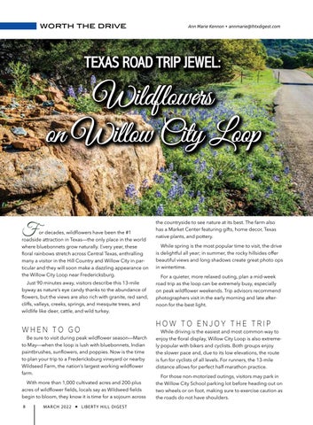 the countryside to see nature at its best. The farm also has a Market Center featuring gifts, home decor, Texas native plants, and pottery. While spring is the most popular time to visit, the drive is delightful all year; in summer, the rocky hillsides offer beautiful views and long shadows create great photo ops in wintertime. For a quieter, more relaxed outing, plan a mid-week road trip as the loop can be extremely busy, especially on peak wildflower weekends. Trip advisors recommend photographers visit in the early morning and late afternoon for the best light.
