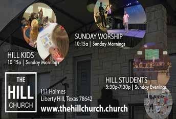 25 NOVEMBER 2022  LIBERTY HILL DIGEST APPAREL, GEAR & ACCESSORIES FOR MEN, WOMEN & KIDS LIBERTY HILL OUTFITTERS LHO WHERE LIBERTY HILL GETS DRESSED! 4892 N. Hwy 183 • Liberty Hill, TX 78642 512-778-6008 • Follow Us on Instagram @HuntersCreekLH Open Bow Season: 8-8 Sat/Sun & 8-6 M-F Open General Rifle Season 8-9 7 Days a Week! NEW! Venison Meatloaf