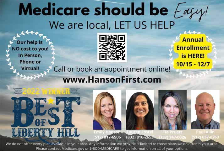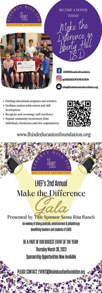 As we approach the season of giving, I hope you find this issue of the Liberty Hill Digest helpful in planning where to give back. Liberty Hill is filled with so many big-hearted folks, which means we have plenty of great charities to sup port. I am not sure there is a town in Texas that gives more, supports more, or loves one another more than our town does. I am so proud to live in it.