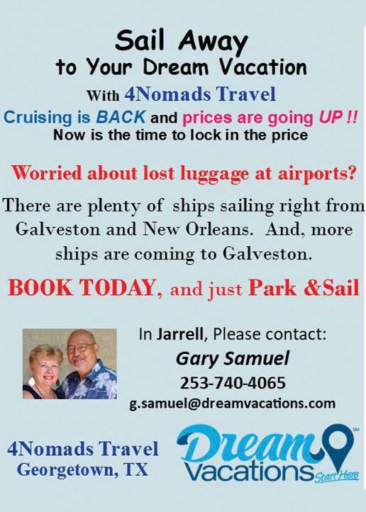 Charlotte Kovalchuk CONTRIBUTING WRITERS Linda A. Thornton • Emily Tilly GRAPHICS & DESIGN Sandra Evans • Ann Marie Kennon CONTRIBUTING PHOTOGRAPHERS Christianna Bettis DISTRIBUTION • David Schumacher IT/WEBMASTER • Jesse Payne CONSULTANT • W. Ben Daniel ADVERTISING Emaleigh Roe 512-641-1370 (Direct) 281-710-5888 (Cell) emaleigh@myjarrell.com MyJarrellMonthlyisa FidelisPublishingGroup,LLCpublication andaproductofAdvocateNewsTXNewspaper. Copyright©2022 All rights reserved. MyJarrellMonthly is published monthly and mailed USPS, free of charge, to homes and businesses in the 76537 zip code. Mail may be sent to My Jarrell, P.O. Box 213, Jarrell, TX 76537. Email: info@myjarrell.com