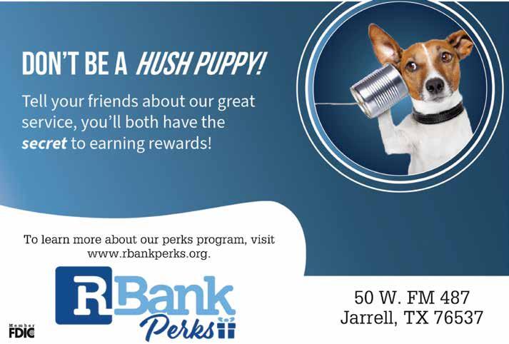 MyJarrellMonthlyisa FidelisPublishingGroup,LLCpublication andaproductofAdvocateNewsTXNewspaper. Copyright©2024 All rights reserved. MyJarrellMonthly is published monthly and mailed USPS, free of charge, to homes and businesses in the 76537 zip code. Mail may be sent to My Jarrell, P.O. Box 213, Jarrell, TX 76537. Email: info@myjarrell.com ADVERTISING INFORMATION nick@myjarrell.com 512-746-4545