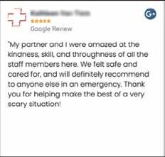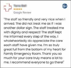 Among the many 5-star Google reviews, high quality care is mentioned constantly. One recent review says, “This is by far the best ER I have ever been to in my life. Unfortunately, I’ve had quite a few visits to ERs…this one outshines them all. I actually don’t dread having to go to the ER because the experience is always so above par here.”