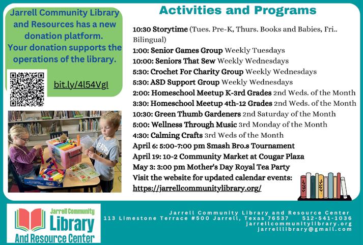 Works closely with Jarrell Independent School District, the Jarrell Chamber of Commerce, Sonterra MUD, Jarrell Economic Development Corporation, Jarrell Community Library and Resource Center, and the City of Jarrell.