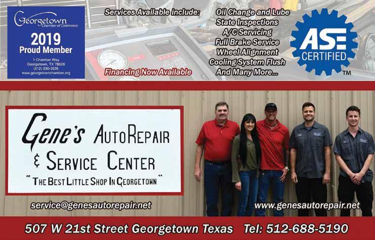 56 NOVEMBER 2022 507 W. 21st St. • Georgetown • 512.688.5190 • genesautorepair.net Your vehicle can be repaired for as little as $39 down with 100 days same as cash! Ask for details! SERVICES AVAILABLE INCLUDE: ∙ Oil Change and Lube State Inspections ∙ A/C Servicing Full Brake Service ∙ Wheel Alignment Cooling System Flush & more... Diesel Repair!