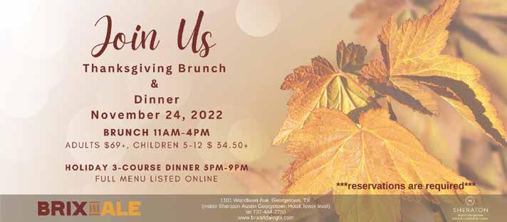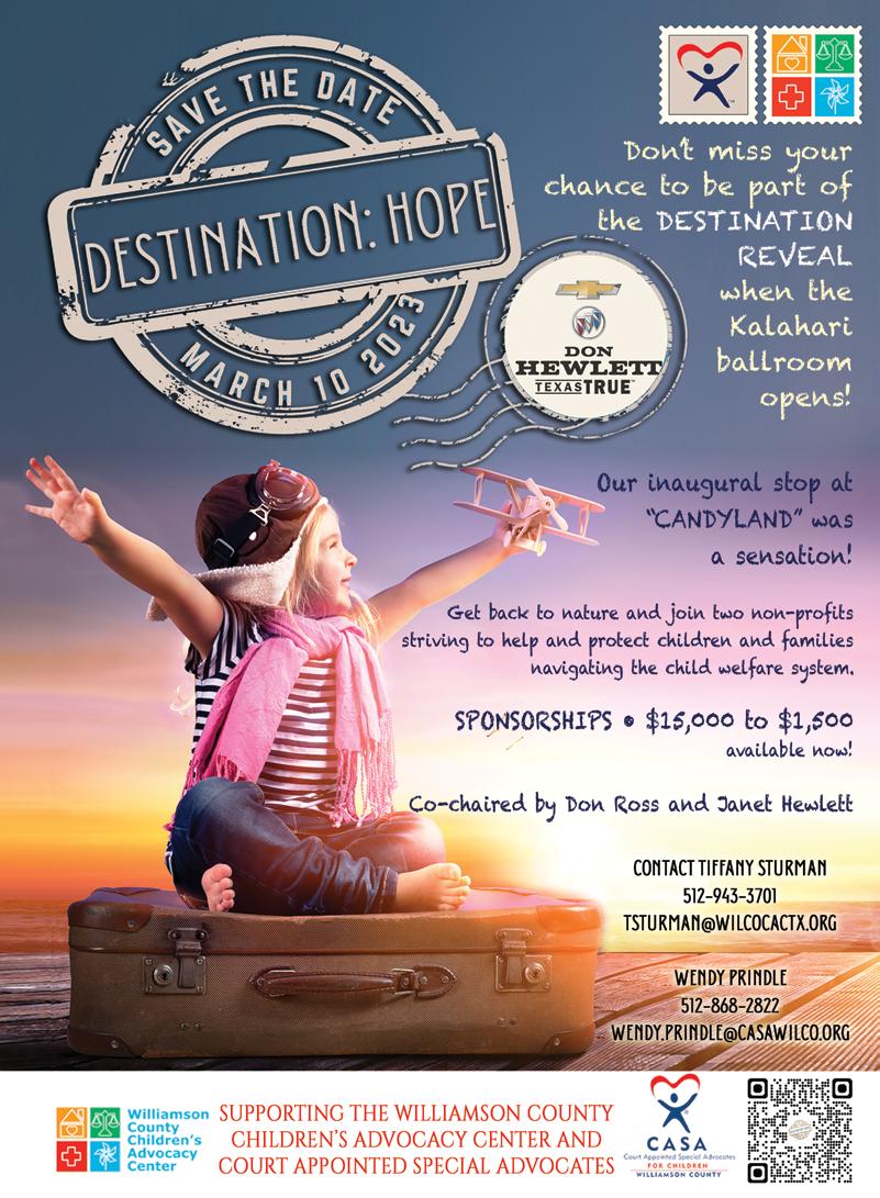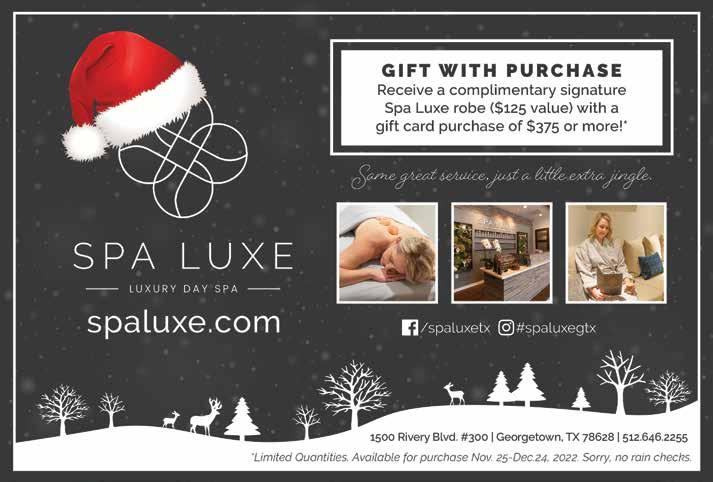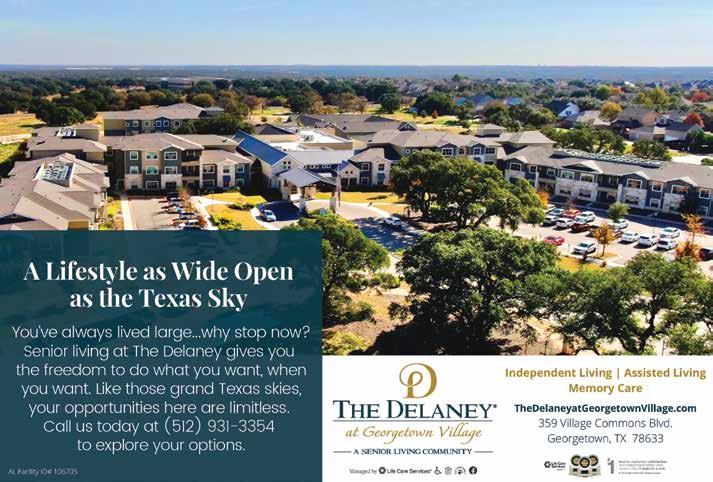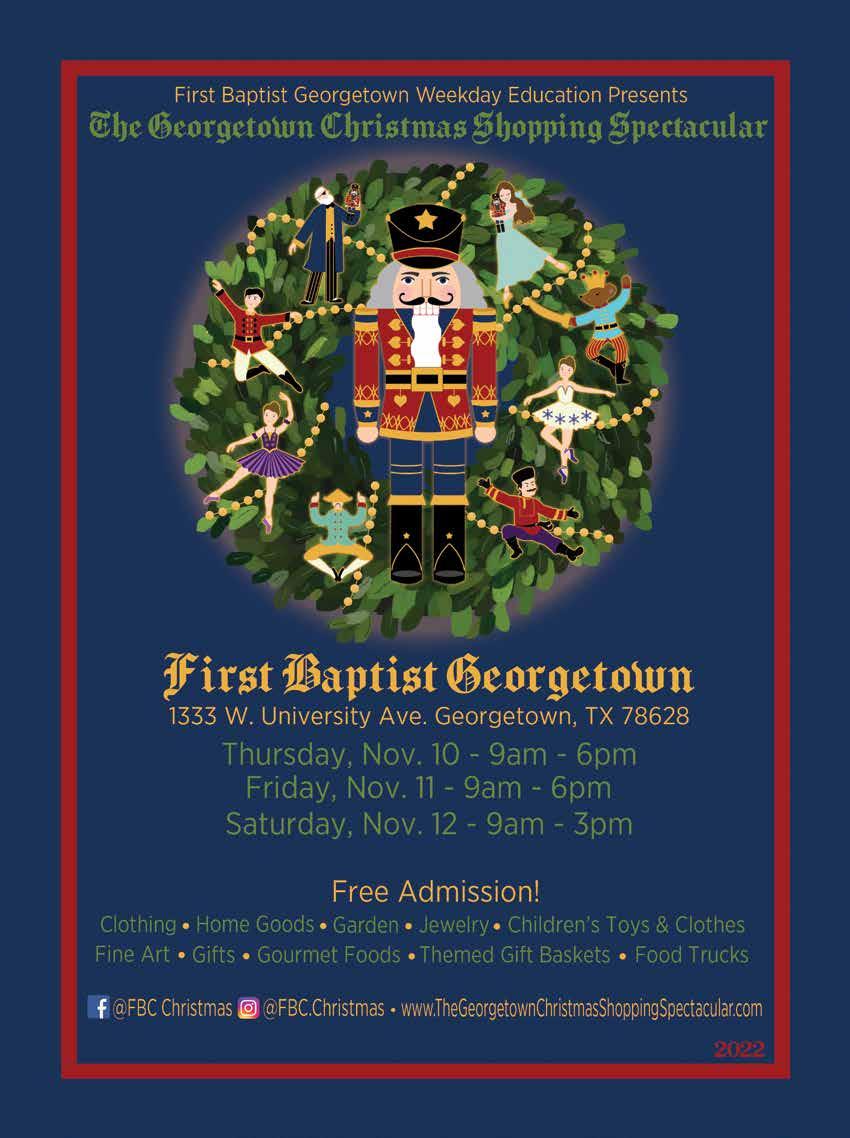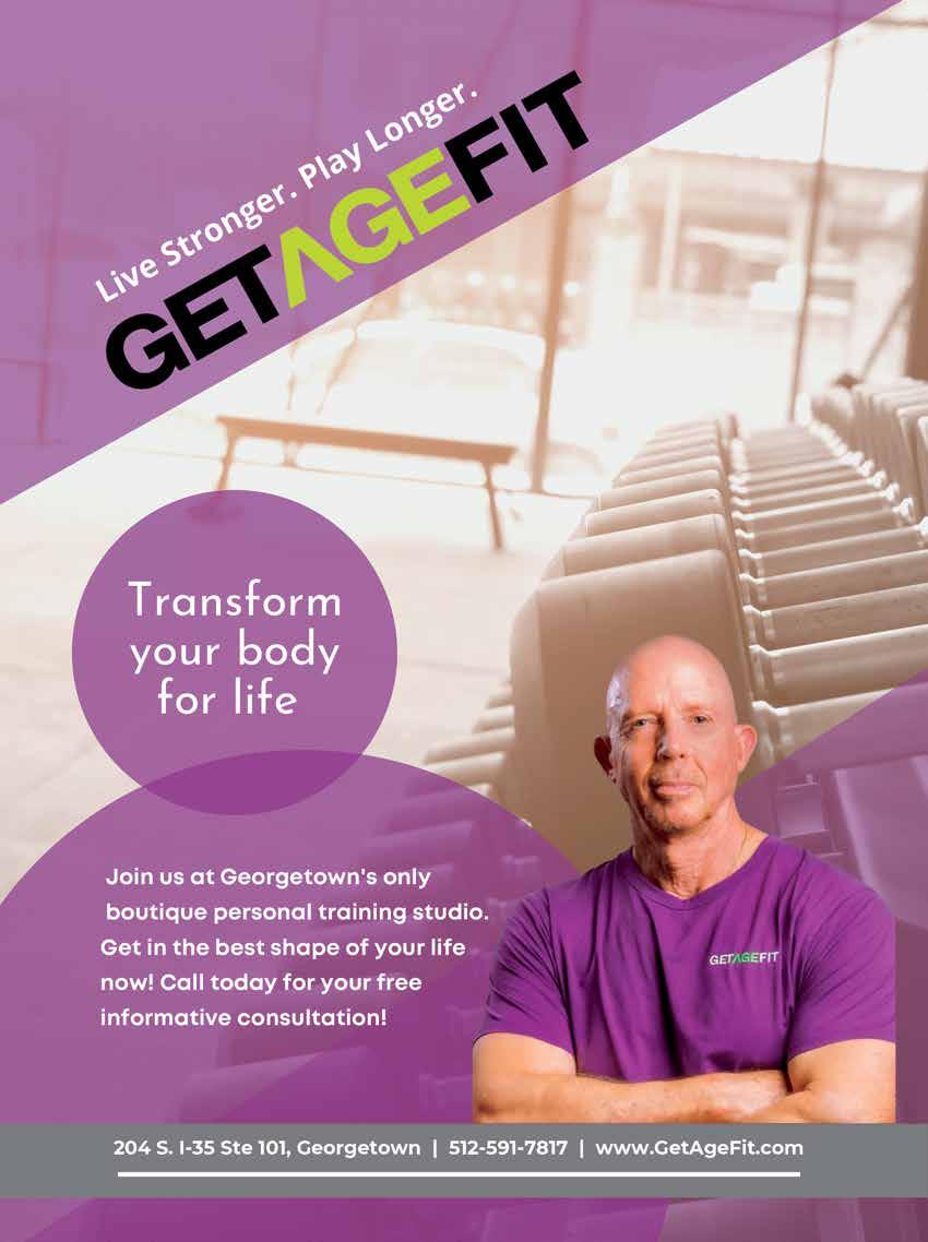 COPY EDITOR Charlotte Kovalchuk CONTRIBUTING WRITERS Emily Tilly • Linda A. Thornton • Cassidie Cox EXECUTIVE ADMINISTRATOR Camy Reynolds GRAPHICS & DESIGN Sandra Evans • Ann Marie Kennon CONTRIBUTING PHOTOGRAPHERS Rudy Ximenez • Christianna Bettis IT / WEBMASTER Jesse Payne ADVERTISING Mark Elliott 512-240-2267 • 512-598-3500 mark@georgetownview.com GeorgetownViewisan OptimusMediaGroup,LLCpublication andaproductofAdvocateNewsTXNewspaper Copyright © 2022 All rights reserved. Georgetown View is published monthly and individually mailed USPS, free of charge, to homes and businesses in Georgetown, TX zip codes. Mail may be sent to Georgetown View, P.O. Box 203, Jarrell, TX 76537.