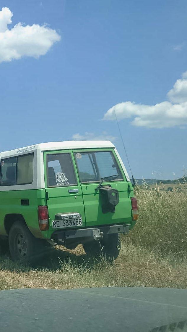 Oltre al Defender possiede un Toyota Hilux allestito per i viaggi fuori confine e una Fiat Panda 4x4 per non annoiarsi.