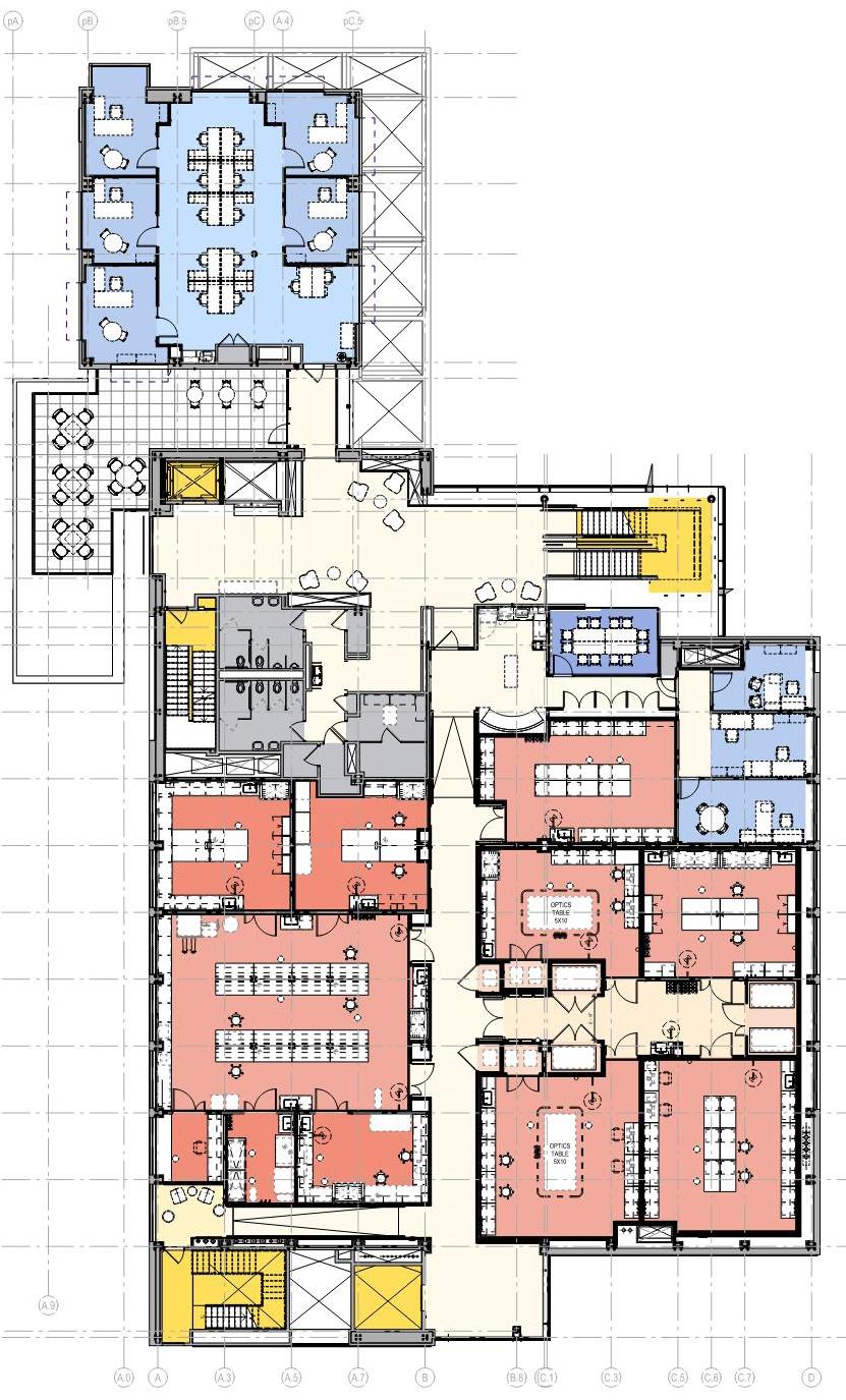 In a research lab intensive building, the circulation spaces and the few social spaces have to do a lot of the work of creating interesting opportunities for respite and to create visual connections between researchers and other people using the building. A major responsibility for me on the project was studying how these opportunities could be created. For instance in the two main circulation corridors (pictured above), i suggested introducing an opening into the floor that brought the energy of the main plaza level lobby into an otherwise drab lower corridor and putting more science on display.