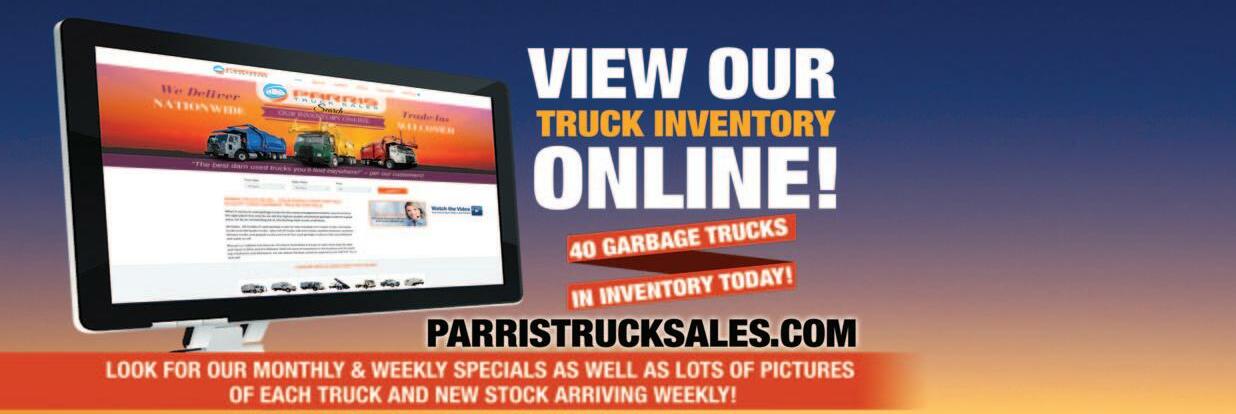 88 www.thehauler.com 1-800-220-6029 2008 MACK w/40 yd EZ Pack Front Loader. 9865 Hours, 80648 Miles, Clean Southern Truck. Good tires just went through shop and ready to go to work! $148,000.00 Call 585-721-6406 • Ask For George 2017 INTERNATIONAL 7400 w/ HD 20 YD McNeilus Rearload Navistar N9, 300 HP diesel, Allison 3000RDS, automatic, single axel with Hendrickson HLM 20K dual tire pusher. Dual drive, conversion for right-hand stand-up drive. Perkins cart tipper, 12K reeving cylinder, container tipper, 3 CY hopper, LED lights. 129,934 Mi, 9763 Hr. Call Matt: 320-272-4692 MUST GO! $124,900 FEATURED COVER STORY - Parris Truck Sales Bar None – We ARE the Front Loader, Rear Loader, Side Loader and Roll-Off truck Specialists! The team at Parris Truck Sales are committed to giving customers a great experience. We take pride in our work, and it shows. Our employees average 20 to 25 years of experience in the business. Our work is top-notch — whether we are performing a minor repair or a total overhaul. Simply put, we do the highest quality reconditioning in the waste management industry. Our fabricators are the best in the business and you’ll
