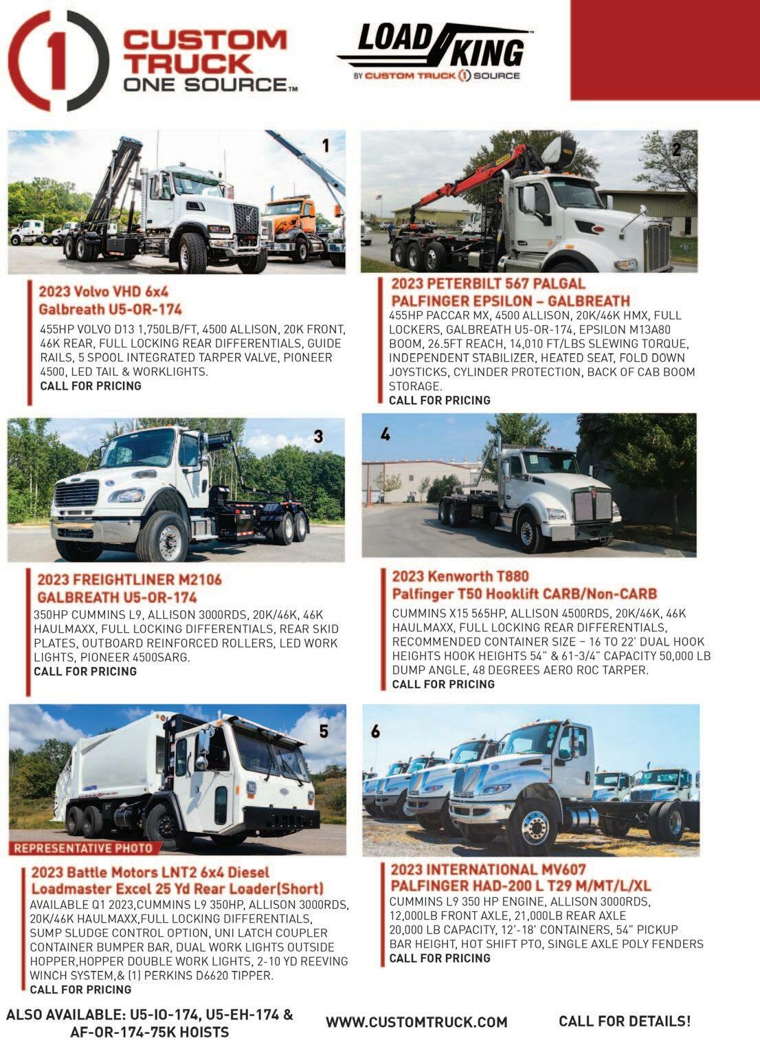 In stock and available for Immediate Delivery 2023 MACK LR64 with a 38 YD Amrep ASL Full Eject. Engine: Mack MP7, Allison 4500 RDS transmission. BODY INCLUDES: -Hydraulic Hopper Cover -Lighting: LED lights: (1) in the hopper, (1) on the arm, (1) Mid-Body turn signal. 4 Corner strobe package and large ecco strobe center of the rear. -Cameras located in the hopper, on the arm, driver side cab and in the rear. CALL FOR PRICING. Call Amber Borchardt! 888-699-2848 info@jwrinc.com www.jwrinc.com JWR Refuse Truck Center - 10 Bobcat Lane Johnson Creek WI 53038 2023 FREIGHTLINER 122SD Galbreath U4/U5-DPHK–176, DETROIT DD13 12.8L 470 HP, Allison 4500 RDS Includes: -Contoured Poly Tandem Fenders -Work lights - Two (2) - 4'' LED -High Visibility Package- One (1) Beacon Light on Tarper Gantry Two (2) Work Lights on Tarper Gantry, and Two (2) Strobe Lights in The Bumper -Toolbox -Pioneer RP4500 Rack n' Pinion Tarping System -Adjustable hook heights via pull pin design (54” & 613/4”) -Versatility for the user to lift containers (16'-20') CALL FOR PRICING. Check out our website for more equipment! UNITS ON THE GROUND 2023 FREIGHTLINER 122SD Galbreath U5-OR-174 Cable Hoist, Detroit DD13 12.8, 470 HP, Allison 4500 RDS, White Includes: -Contoured Poly Tandem Fenders -Work lights - Two (2) - 4'' LED -Toolbox -Pioneer RP4500 Rack n' Pinion Tarping System -Versatility for the user to lift containers (18’-22’) -Pintle Premier Hook with Glad Hands -Safety Visibility Package. Special tower, Wiring harness, bumper, 1- Beacon Light, 2 strobe lights in bumper, 2 work lights on Gantry. CALL FOR PRICING. Stock Photo Stock Photo 78 www.thehauler.com 1-800-220-6029