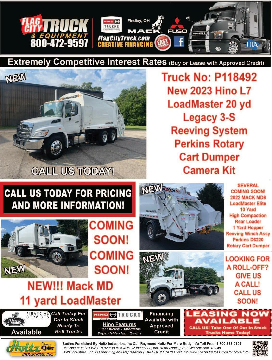 Trucks Built To Work The Power You Need To Take On Tough Jobs! al@interstatetrucksource.com email: al@interstatetrucksource.com 2023 Mack Equipped With: • 40 Yd E-Z Pack Front Loader • MP7 355 HP Engine • Allison 4500 RDS Trans • 20K Front Axle • 46K 2023 LRE Resi-Frontload (can included) • MP7- 355HP • Allison RDS 4500 6 Spd • Aluminum Wheels • Equipped with 40yd EZ Pack Locations In Saginaw & Romulus Michigan 2023 Hino L6 • CALL NOW! Cummins 240/ 260 HPs, Allison RDS 3000 10-16 yd Rearload bodies, Reeving Cylinder and Cart Tipper, Taking orders, Many on the way ! 5 DIFFERENT REAR LOADS READY FOR SHIP OUT. 2 Loadmaster, 2 EZ Pack, and 1 Curbtender. Please Call Al Bryant for Details.