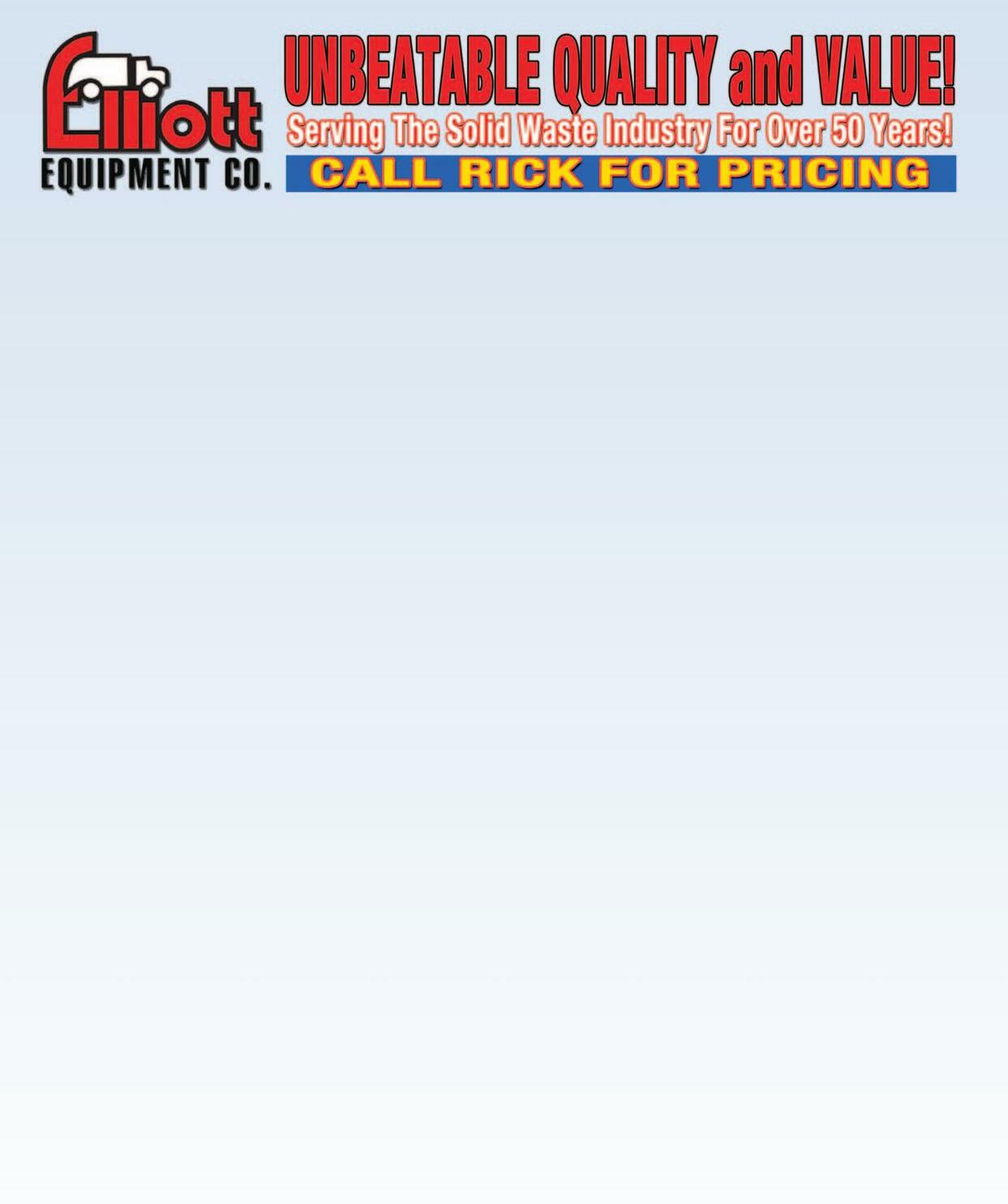 1-800-220-6029 www.thehauler.com 37 COMPACTOR RECEIVER BOXES OPEN TOP CABLE ROLL-OFFS 10-70 Yards FLAT BEDS & SUBFRAMES BUILT TO YOUR SPECS. REAR LOAD CONTAINERS 1 through 8 yard IN STOCK WE MANUFACTURE ALL STYLES OF HOOKLIFT CONTAINERS TUB CONTAINERS RECYCLING CONTAINERS FRONT LOAD CONTAINERS n ALL our CONTAINERS are PRIMED and PAINTED Inside and Out. n SEAMS are WELDED SOLID. n SPECIAL ATTENTION is given to all High-stress and High-wear Areas. n CUSTOM ITEMS built to your specs at REASONABLE PRICES. n DELIVERY AVAILABLE for Large or Small quantities at reasonable rates. 888-995-8199 570-962-2194 CALL 24 HOURS A DAY!