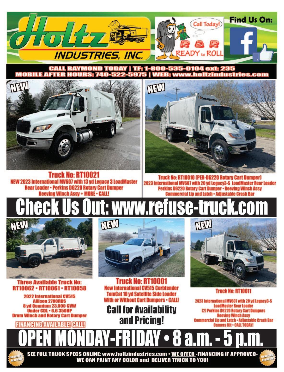 In need of a packer truck to add to your fleet? How about a roll-off truck, hook-lift truck or can delivery truck? We have many used and new refuse trucks READY TO GO TO WORK TODAY! Visit us online @ www.holtzindustries.com and click on “TRUCKS FOR SALE” to view all our IN STOCK TRUCKS! Or give RAYMOND HOLTZ a call at extension 235 for more information!