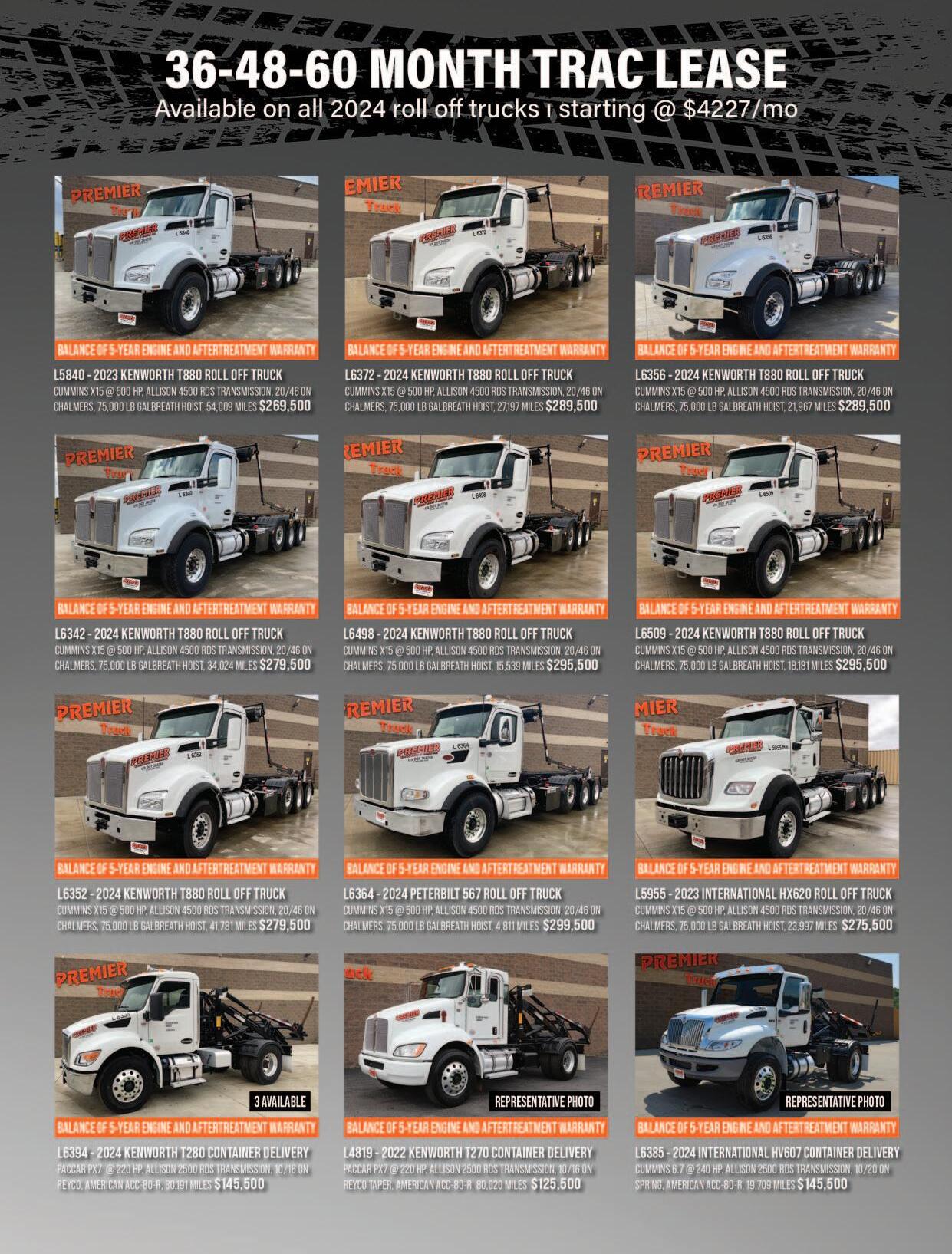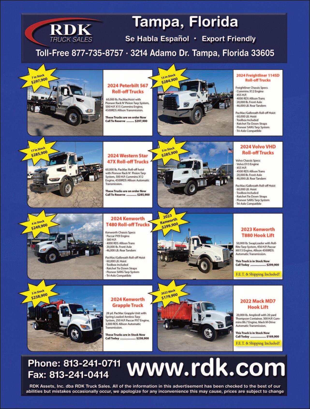 136 www.thehauler.com 1-800-220-6029 Olympic Sales (ND) 701-281-8221 Email: michael@olympicsalesinc.com Pictures Available @ www.northlandtrucksales.com HERE AND READY TO GO • New 2024 Peterbilt 548 w/New Way 25yd Cobra Magnum, all 3 attachments • New 2024 Freightliner M2106 w/20yd New Way Cobra, all 3 attachments • NEW 2023 Freightliner M2106 w/Bucher Municipal E35m sweeper, mechanical • 2015 Peterbilt 320 w/31yd Heil ASL, Python arm, 124,697 miles, 13,477 hrs. • Great Lakes Pup Trailers NEW 2024 KENWORTH T880 w/50K Ampliroll hooklift, MX13 510 hp Paccar, Allison 4500, Roll-Rite auto tarper, air ride, air suspension, pintle hitch, 20k front, 46k rear NEW 2024 PETERBILT 389 W/50K AMPLIROLL HOOKLIFT, MX13 510HP, ALLISON 4500, AIR RIDE, AIR SUSPENSION, 20K FRONT, 46K REAR, ROLL-RITE AUTO TARPING SYSTEM NEW 2023 PETERBILT 537 w/20yd New Way Cobra, all 3 attachments NEW 2024 FREIGHTLINER 114SD w/50K Ampliroll hooklift, O’Brian Diablo tarper 2020 FREIGHTLINER M2-106 with 20 yard New Way Cobra Rear loader DD8 Engine, Allison Transmission, Single Cart Tipper, 89,675 Miles, 7,053 Hours CALL OR TEXT 804-677-4376 $176,000 2019 ISUZU 146,700 miles, 8 yd Curbtender body with cart tipper $101,000