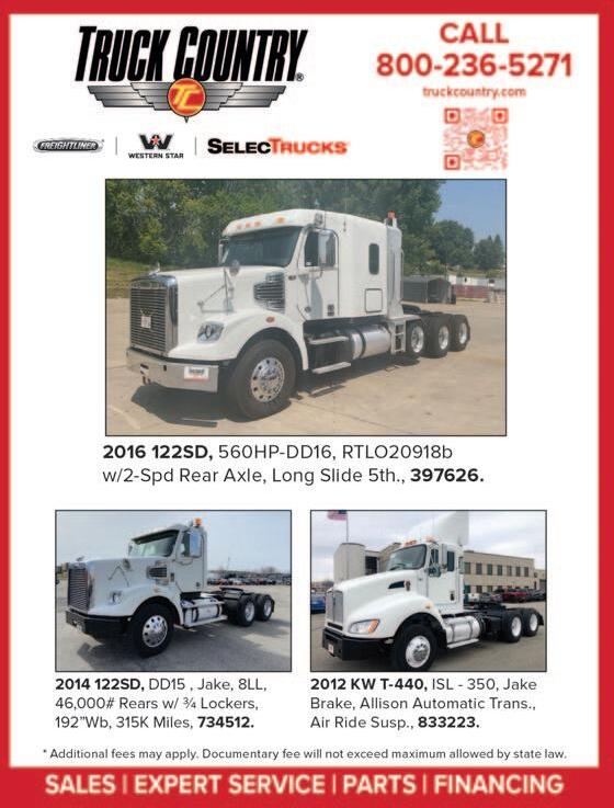Olympic Sales (ND) 701-281-8221 Email: michael@olympicsalesinc.com Pictures Available @ www.northlandtrucksales.com • NEW 2023 Freightliner M2106 w/Bucher Municipal E35m sweeper, mechanical • NEW 2023 Freightliner M2106 w/Bucher Municipal R65m sweeper, regenerative air • NEW 2023 Peterbilt 537 w/20 yd New Way Cobra, all 3 attachments • 2023 Freightliner M2 106 w/20 Yd New Way Cobra w/all 3 attachments • 2007 International 7400 w/25yd Leach 2RIII rear load, 255,223 miles, 20,520 hrs. • 2005 Sterling w/25yd Leach 2RIII, tandem & tag, winch only • Great Lakes Pup Trailers NEW 2023 Great Lakes SR2440 pup trailer, double axle. 2023 KENWORTH T880 w/50K Ampliroll hooklift, X15 450 HP Cummins, Allison 4500, Roll-Rite auto tarper, pintle hitch, 20K Front, 46K Rear. NEW 2023 FREIGHTLINER M2 106 W/20YD NEW WAY COBRA, ALL 3 ATTACHEMENTS 2015 PETERBILT 320 W/31YD HEIL ASL, PYTHON ARM, 124,697 MILES, 13,477 HRS. 2001 GVW 26000 Non CDL 3126 CAT Eng. 10 ton, 36” K-PAC hooks Well Maintained NEW Tires, 6 spd $40,000 2004 GVW 29.900 CDL NEWER 3126 CAT Eng. 10 ton, 36” K-PAC hooks Well Maintained, NEW Tires 35K mi, 6 spd $60,000 Call Mario 570-885-1006