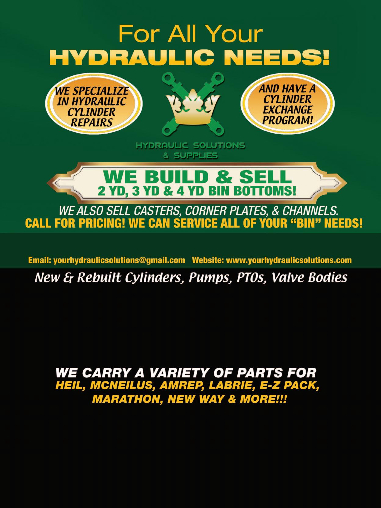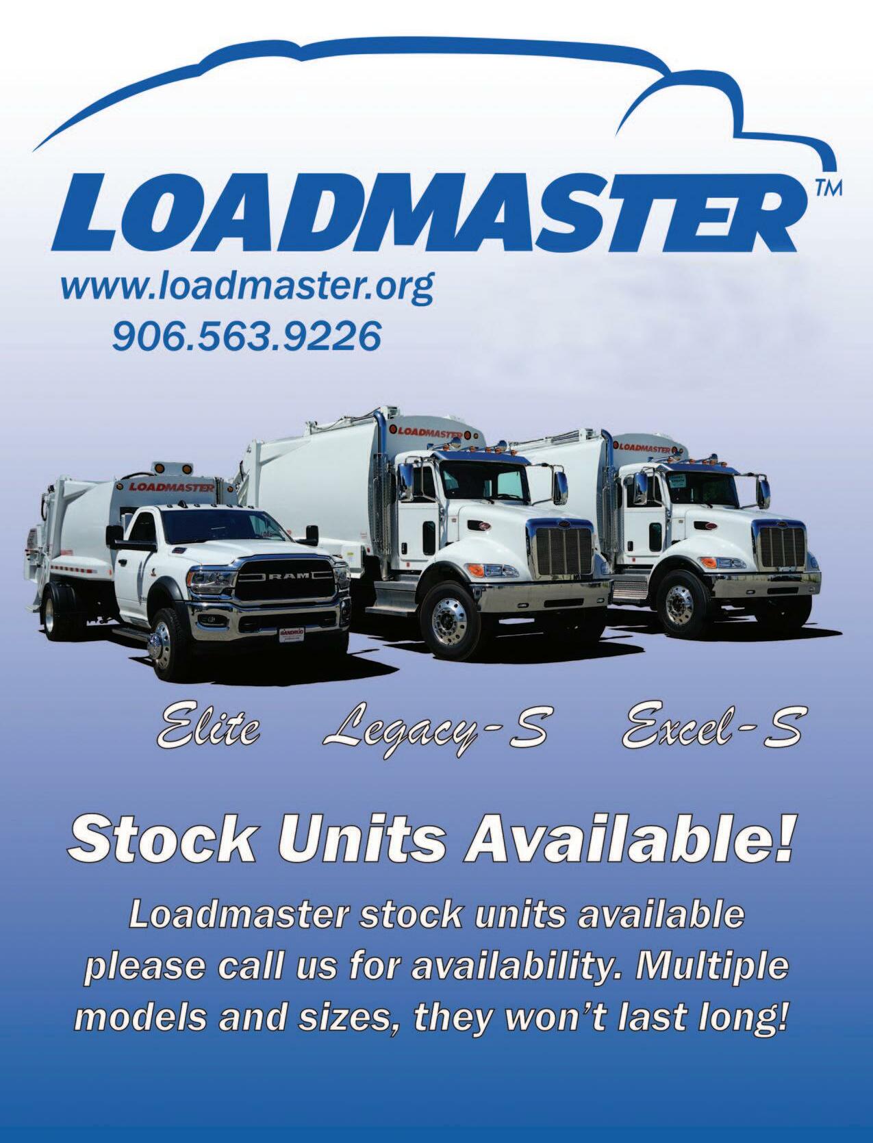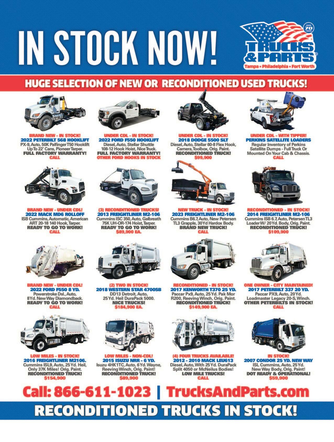 1-800-220-6029 www.thehauler.com 107 Contact Allen Brasington • 828-575-7865 email: allen@smartbusinesscredit.com www.SmartBusinessCredit.com WE WILL FINANCE ANY EQUIPMENT THAT MAKES SENSE FOR YOUR BUSINESS. DUMPSTERS INCLUDED! WE FINANCE GARBAGE TRUCKS AND WASTE EQUIPMENT! WHO WE FINANCE: Purchase from private parties, auctions, dealers and more. All credit types considered. WHAT WE FINANCE: Equipment purchases from $10,000 to $1,000,000 including: Trucks, UnderCDL, Commercial Vehicles, Dumpsters, Roll Out Carts, Heavy Equipment, Drilling Equipment, Excavators, Agricultural Equipment, Yellow Iron and Many More. 419-481-8511 • www.LKQHeavyTruck.com $8,500 each 2003 MACK MR688 300hp Mack AI, 4000 series Allison, Full locker rears, 5.63 ratio, Single steer, Fleet Maintained. Just pulled from service. Mileage ball parks 90k Leach 2RII bodies, 25 yard HEAVY TRUCK GOODY’S Bearing/Sealed, Tested/Inspected, Running Take-outs Many engine options to choose from. Call for Details!!! New FULL LOCKER Axle Assembly’s available. CALL FOR PRICING AND AVAILABILITY!! REMAN FULLER Transmissions. Many models available! CALL TODAY FOR PRICING!!! 6180 Hagman Rd Toledo, OH 43612