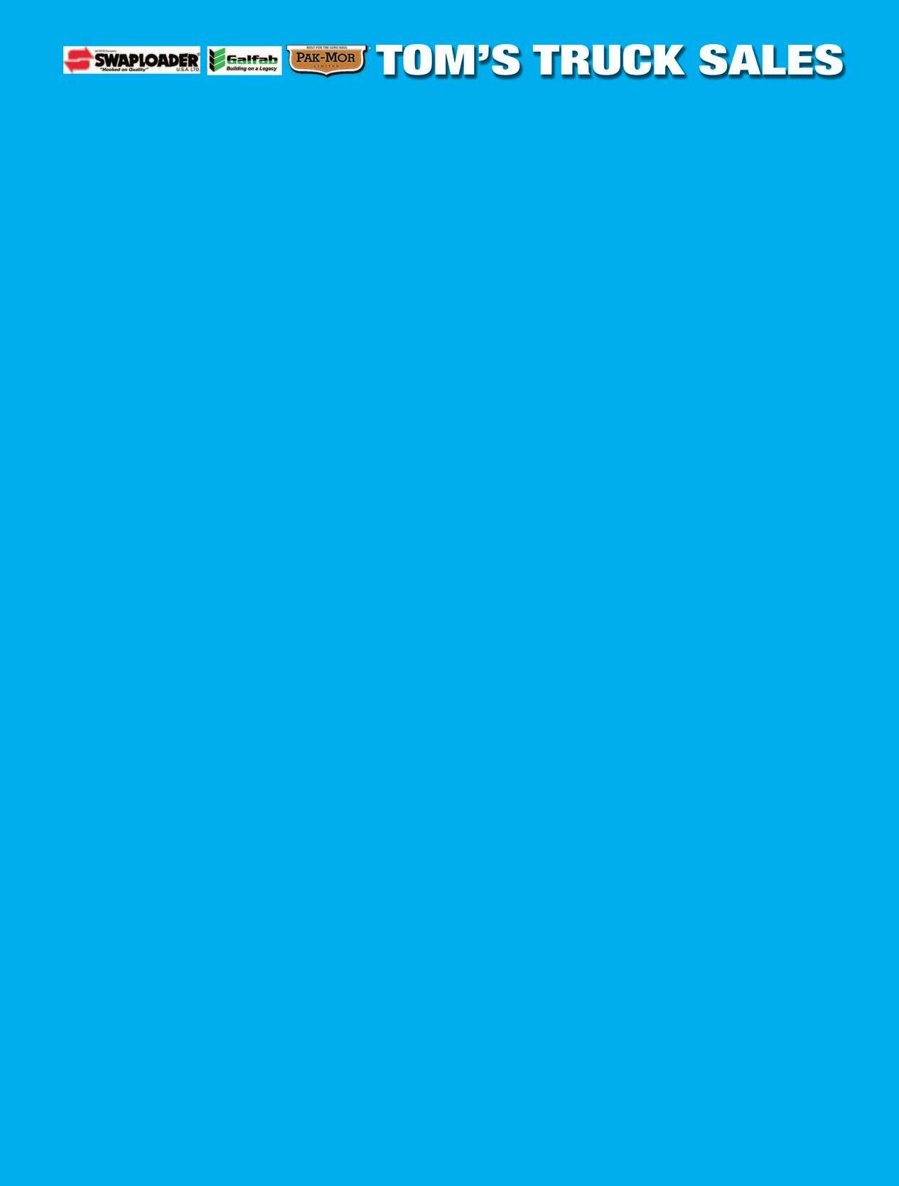 WEBSITE: www.tomstrucksales.com & www.trashtrucks.net E-MAIL: tomstrucksales@aol.com DELIVERY & FINANCING AVAILABLE • OVER 250 TRUCKS IN STOCK 12099 Marsh Road • Bealeton, VA 22712 • PHONE: 800-361-7305 • FAX: 703-361-5342 CHECK OUT OUR PRICE CUTS!! 2008 KENWORTH 14 YD Pakmor, PX6, Allison $79,900 2002 CCC LE 20 Yd Dempster Packer, Cummins ISM, 106K miles $34,900 2007 FREIGHTLINER 11 YD Newway, Mercedes, Automatic, Winch & Tipper $79,900 Non CDL 11 YD Newway, DT466, Allison, Barker Tipper CALL FOR PRICE Non CDL 2004 MITSUBISHI FUSO Diesel, Automatic, 85K Miles, 16 YD Newway Cobra $39,900 60K Hoist, Triaxle, E7350, 8 spd $37,900 E7350 Engine, 32K hours $39,900 Galbreath, Tarp System $39,900 E7 Engine, 18/46, 60K lb Galbreath $39,900 2002 FREIGHTLINER FL50 6 YD Newway, 5.9 Cummins, Automatic, Hydraulic Brake CALL FOR PRICE 16K Front, 40K Rear $84,900 20 YD Leach, Diesel, Automatic, 113K Miles $69,900 Cummins, Allison, 6 YD Heil SL $59,900 Non CDL 2008 CHEVROLET 20 YD PAK-MOR Kodiak C8500, Isuzu Eng, 132K Miles $49,900 $47,900 1997 GMC 13 YD Martco SL Diesel, Automatic, 200K Miles, Municipal Unit, Tipper $29,900 2012 HINO 338 13 YD Newway Cobra, Diesel, Automatic, Reever, 138K Miles $89,900 Tipper CALL FOR PRICE Allison, Tipper $69,900 20 Yd McNeilus Packer, 16K Front, 23K Rear, 157K Miles, 16K Front, 23K Rear, Mercedes Engine $54,900 Winch, Kickbar $29,900