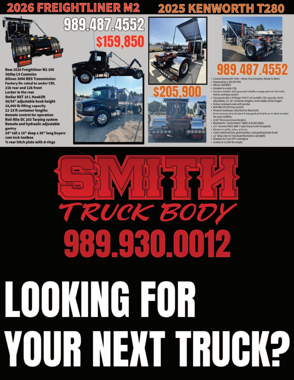 2026 MACK MD7, 25,999 GWV, 325 HP Cummins, 3000 RDS Allison Automatic, Exhaust Brake, Differential Lock, Roll Rite Tarp System, Swap Loader 214, 20,000 # Capacity, Will Accept 12’ to 18’ Containers, Adjustable Jib 35 5/8” or 53 7/8”.