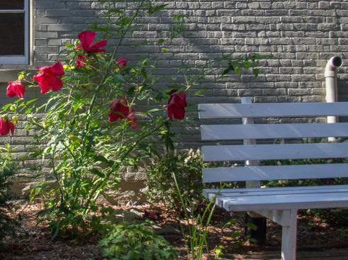 A peaceful and thoughtfully designed space, this garden is filled with perennial roses and other plantings. Engraved paver bricks honor loved ones and special occasions.