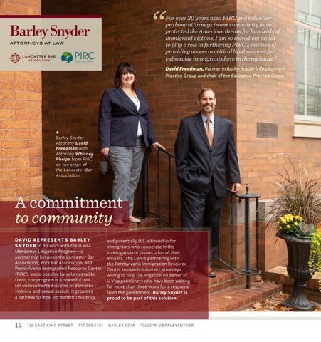 A commitment to community D AV I D R E P R E S E N T S B A R L E Y S N Y D E R in his work with the U Visa Mandamus Litigation Program—a partnership between the Lancaster Bar Association, York Bar Association, and Pennsylvania Immigration Resource Center (PIRC). Made possible by volunteers like David, the program is a powerful tool for undocumented victims of domestic violence and sexual assault. It provides a pathway to legal permanent residency
