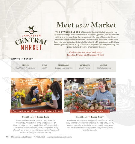 Meet us at Market T H E S TA N D H O L D E R S of Lancaster Central Market welcome you! Established in 1730, more than 60 local purveyors, growers, and artisans are waiting to greet you three days a week with the best of Lancaster County. From two of the newest stands like Soulcialize and Amaranth Gluten Free Bakery, to long-established standholders like Groff’s Vegetables and S. Clyde Weaver, you can find an array of fresh and prepared foods representing the proud cultural diversity of Lancaster County. Ready to greet you with a smile every Tuesday, Friday, and Saturday 6-3pm W H AT ’ S I N S E A S O N APPLES