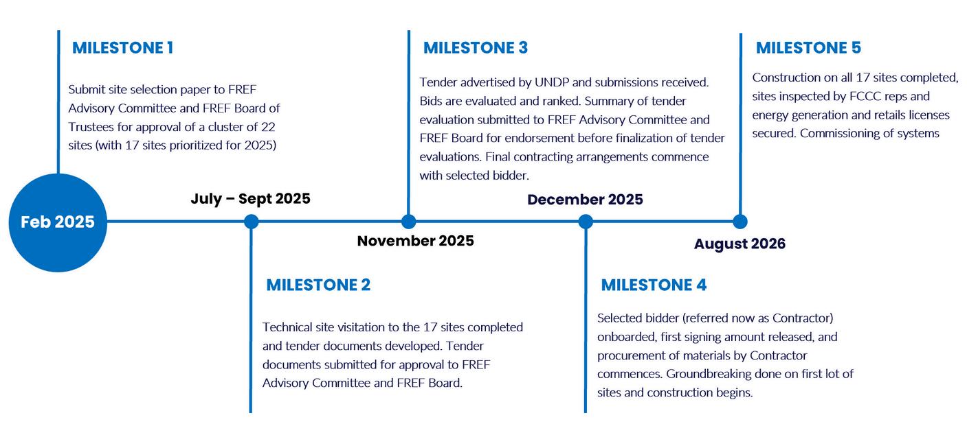Preparations for Stage 2 tender are well underway as a multi-agency technical team from the Department of Energy, UNDP, Ministry of Trade, Co-operatives, Small and Medium Enterprises, Ministry of iTaukei Affairs, and Arizona State University is conducting comprehensive technical scoping and socio-economic validation of 22 communities across Lomaiviti, Kadavu, and Lau, from which 17 will be shortlisted based on a multi-dimensional criterion established under the FREF Operation and Financial Manual. The commencement of construction for Stage 2 sites is planned for February 2026, with commissioning scheduled for August 2026.