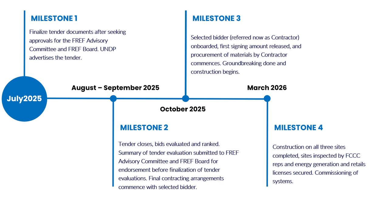 Stage 1 Tender advertised with closure of tender expected on 29 August 2025. A multi-agency technical team from the Department of Energy, UNDP, Ministry of Trade, Co-operatives, Small and Medium Enterprise, Ministry of iTaukei Affairs, and Arizona State University began detailed scoping of Stage 2 sites in Lomaiviti