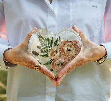 In mijn atelier maak ik gedenkobjecten, sieraden en andere tastbare herinneringen. Ik verwerk onder meer bloemen, as, haren, vingerafdrukken, foto’s of persoonlijke voorwerpen in epoxy. Dit is een kunsthars, die eruitziet als glas. Een mooi alternatief voor de traditionele urnen. Ik vind het heel bijzonder om mijn creativiteit te mogen omzetten in een tastbare, persoonlijke herinnering.