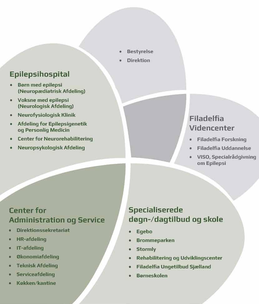 Filadelfia har egen bestyrelse og direktion. Organisationen består af hospital, sociale tilbud og fælles afdelinger, som støtter op om kernefunktionen.