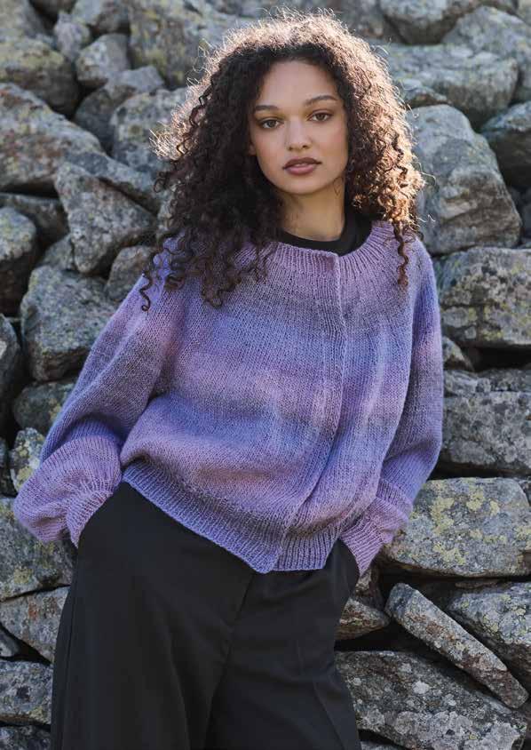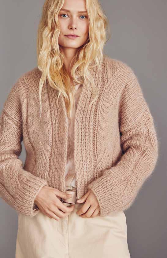 Les fibres du bébé lama confèrent à ces deux modèles un volume généreux et un confort exceptionnel. Le pull est tricoté de bas en haut sans couture. Le cardigan à droite est tricoté de haut en bas.