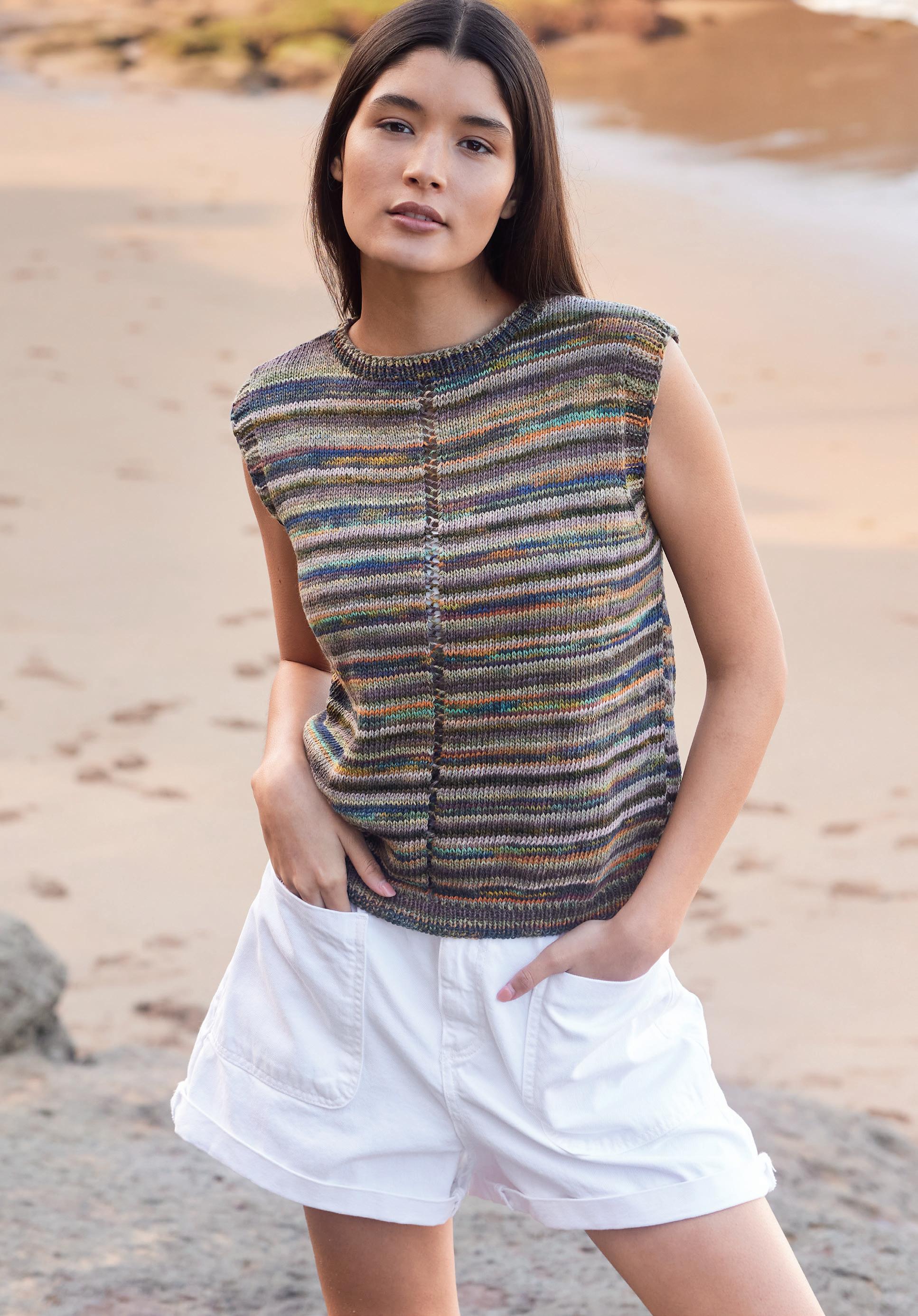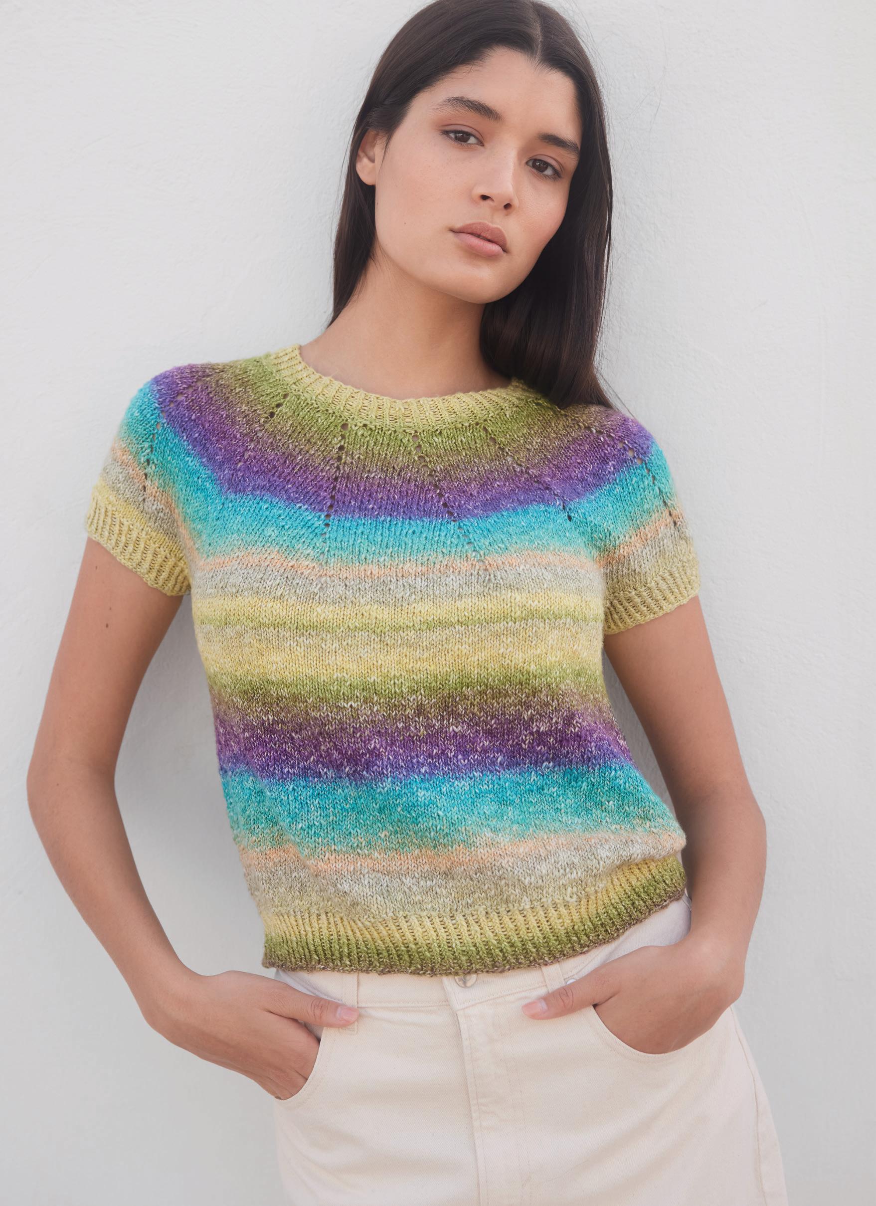 Neuzugang Arco besteht aus einem Baumwollgemisch in zarter Kettenkonstruktion. Verstrickt ergeben sich feine, unregelmäßige Streifen, die auch simplen Teilen einen Wow-Look verleihen.