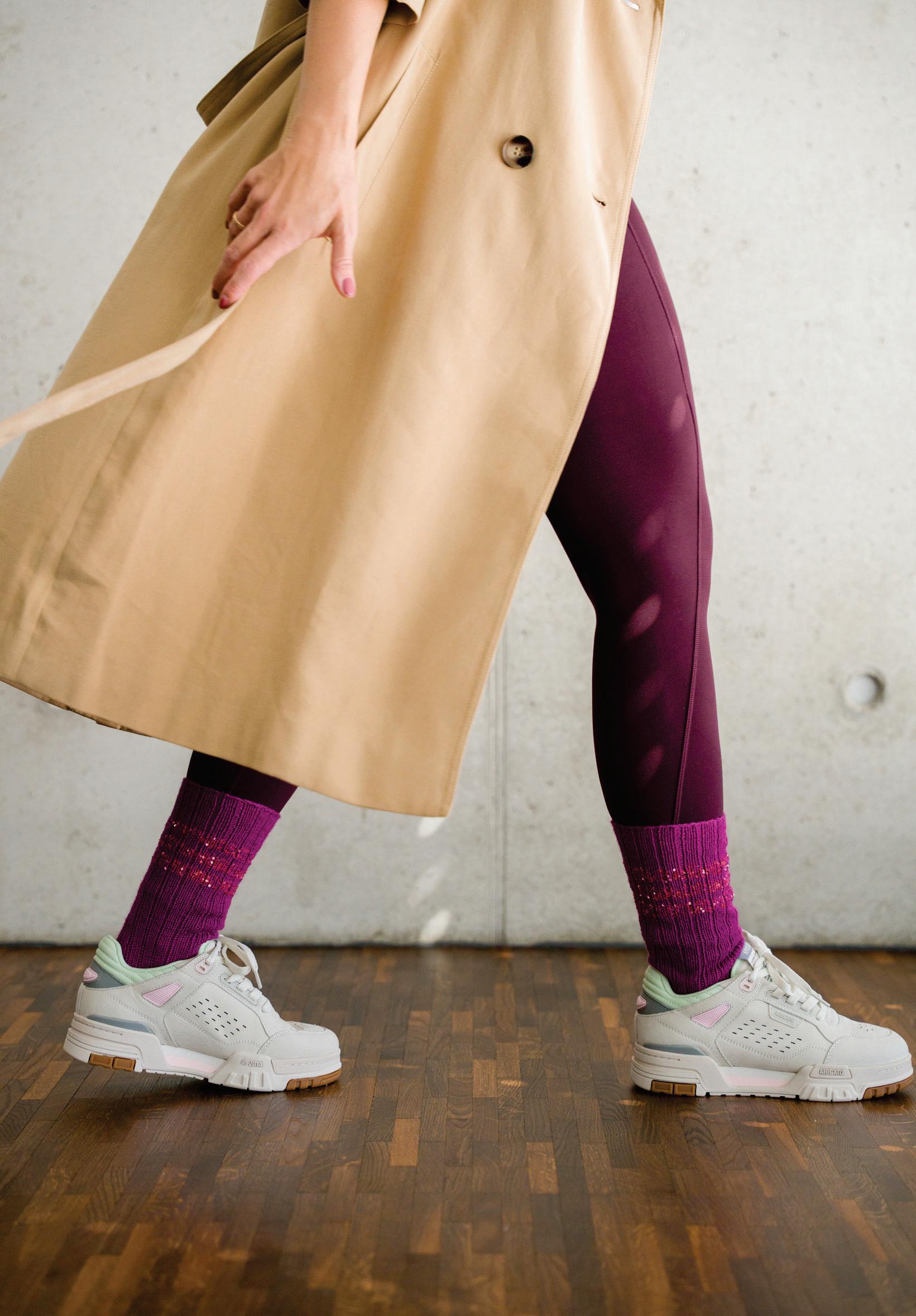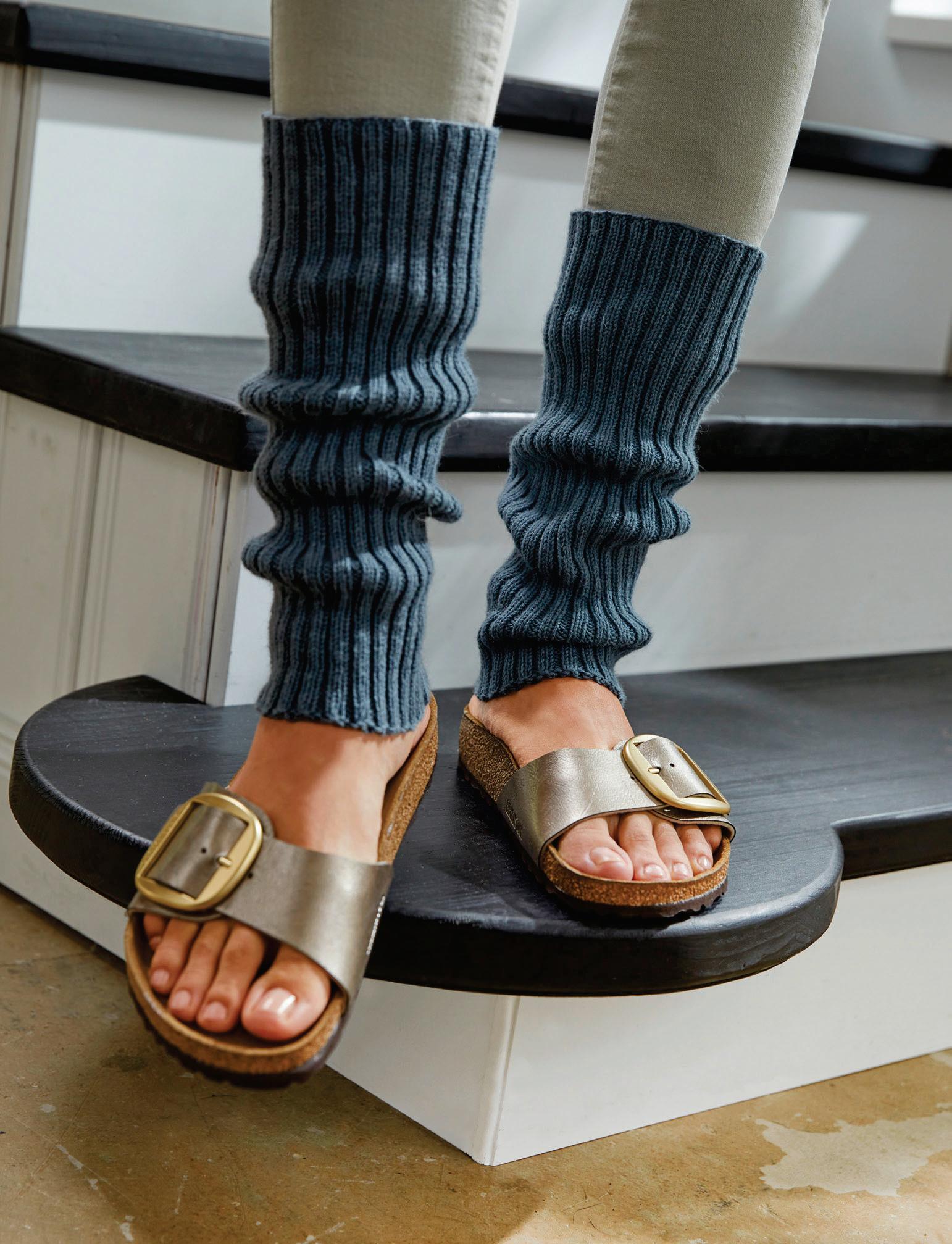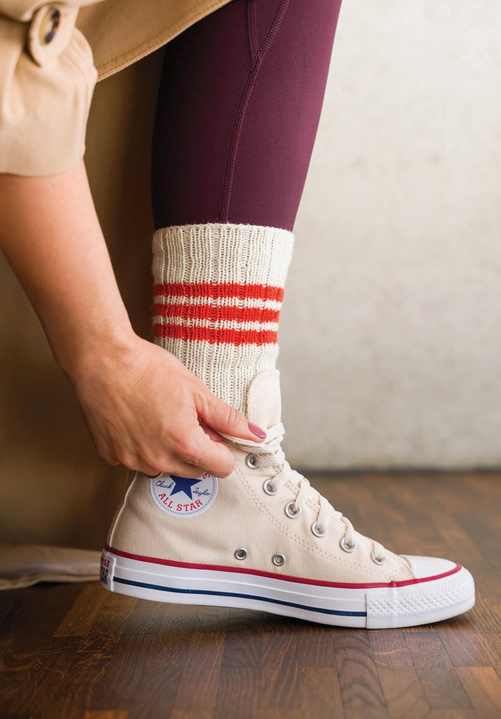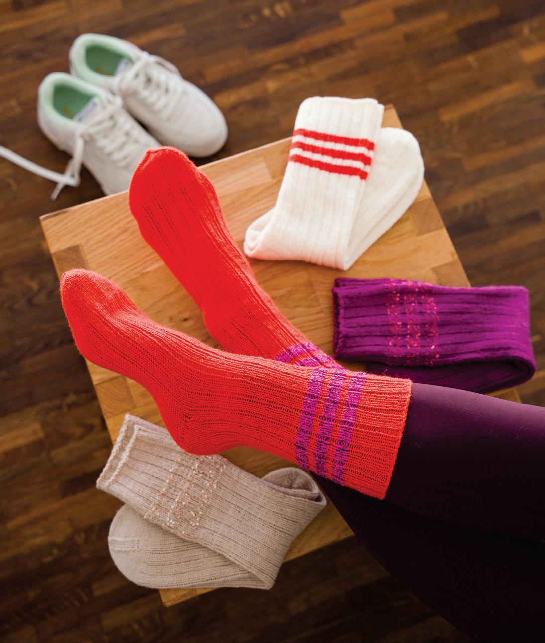 Ob mit sportlichem Touch, wie hier, oder verspielt und puristisch, wie die Modelle auf den nächsten Seiten – am Beispiel von drei verschiedenen Bündchen zeigen wir Ihnen, wie aus einem Paar Socken ein stylisches Accessoire wird. Außerdem haben wir noch ein Paar Stulpen für Sie, die – ruckzuck gestrickt – bestimmt bis zur nächsten Yogaoder Pilatesstunde fertig sind. Seite 28/29