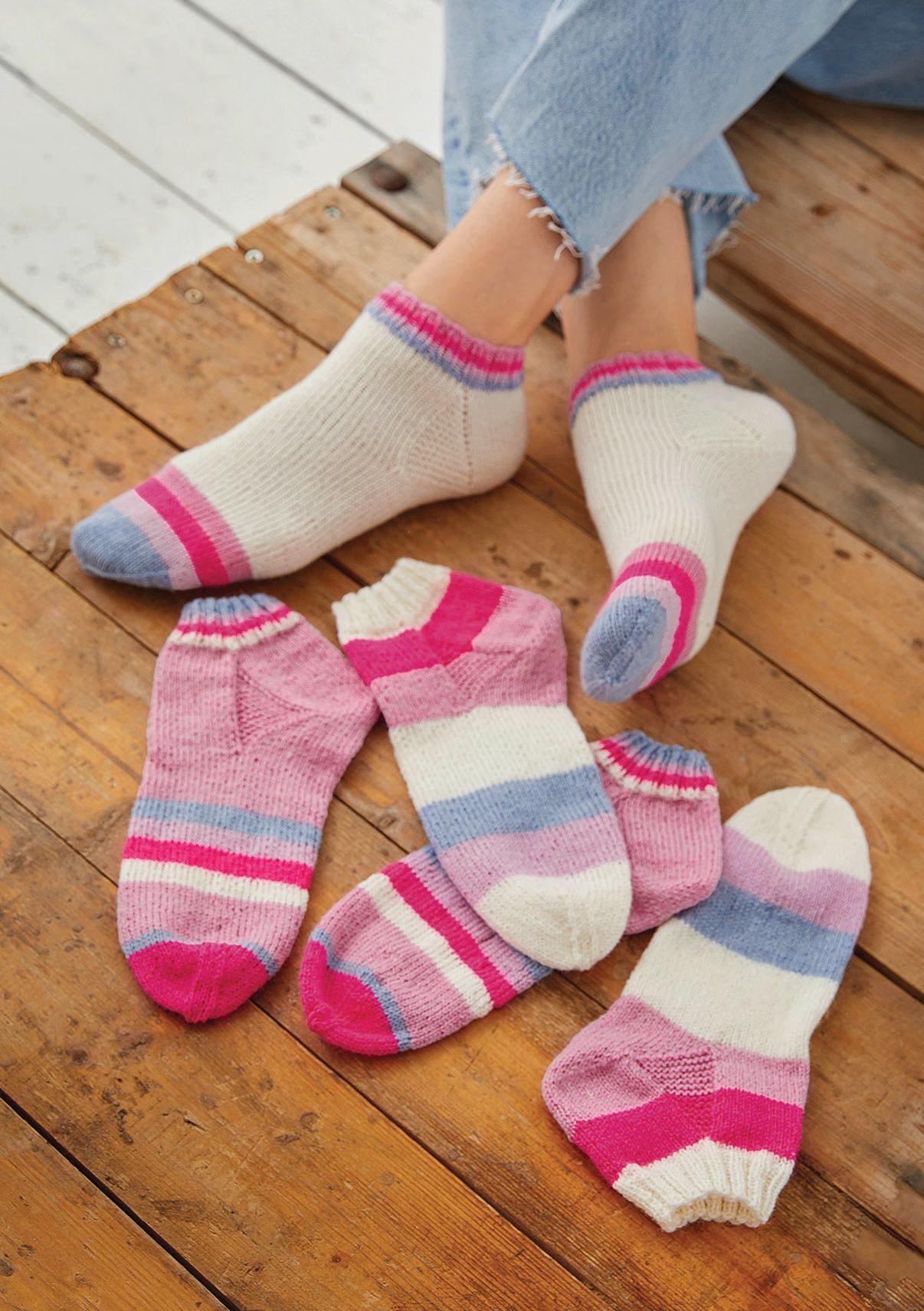 Ein Paar behalten, zwei Paar verschenken – oder umgekehrt? Einfach noch je ein 50g-Knäuel in Rohweiß und Nelke ergänzen und das Restmaterial reicht für alle drei Sockenpaare!